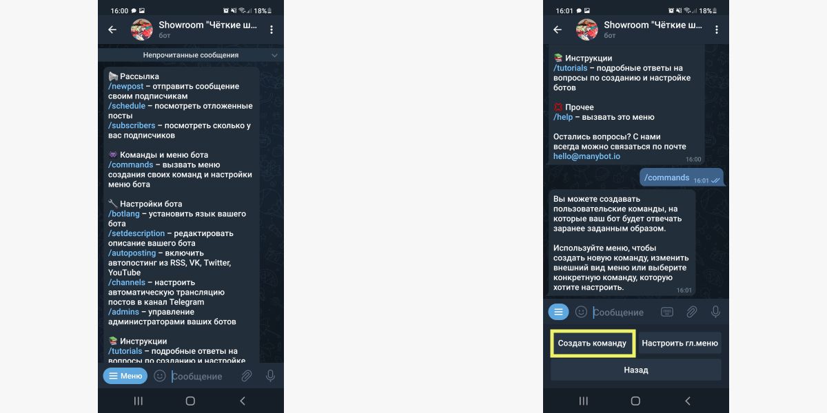 В чате выбираем пункт «Создать команду». Бот ответит вам, что вы можете создавать разные команды, на которые он будет отвечать заранее заданным образом.