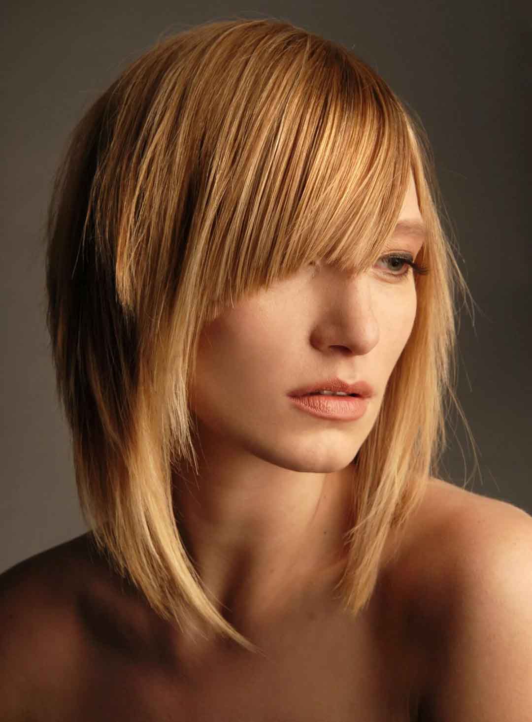 Средняя длина волос – самая распространенная. Универсальным вариантом станет рваное каре с удлиненной челкой. Такая прическа выглядит наиболее естественно, придает образу дерзости, озорства. Разноуровневые прядки делают стрижку более стильной. Отлично подходит молодым девушкам, которые любят находиться в центре внимания. Также рваная челка подойдет и к другим стрижкам на средние волосы.