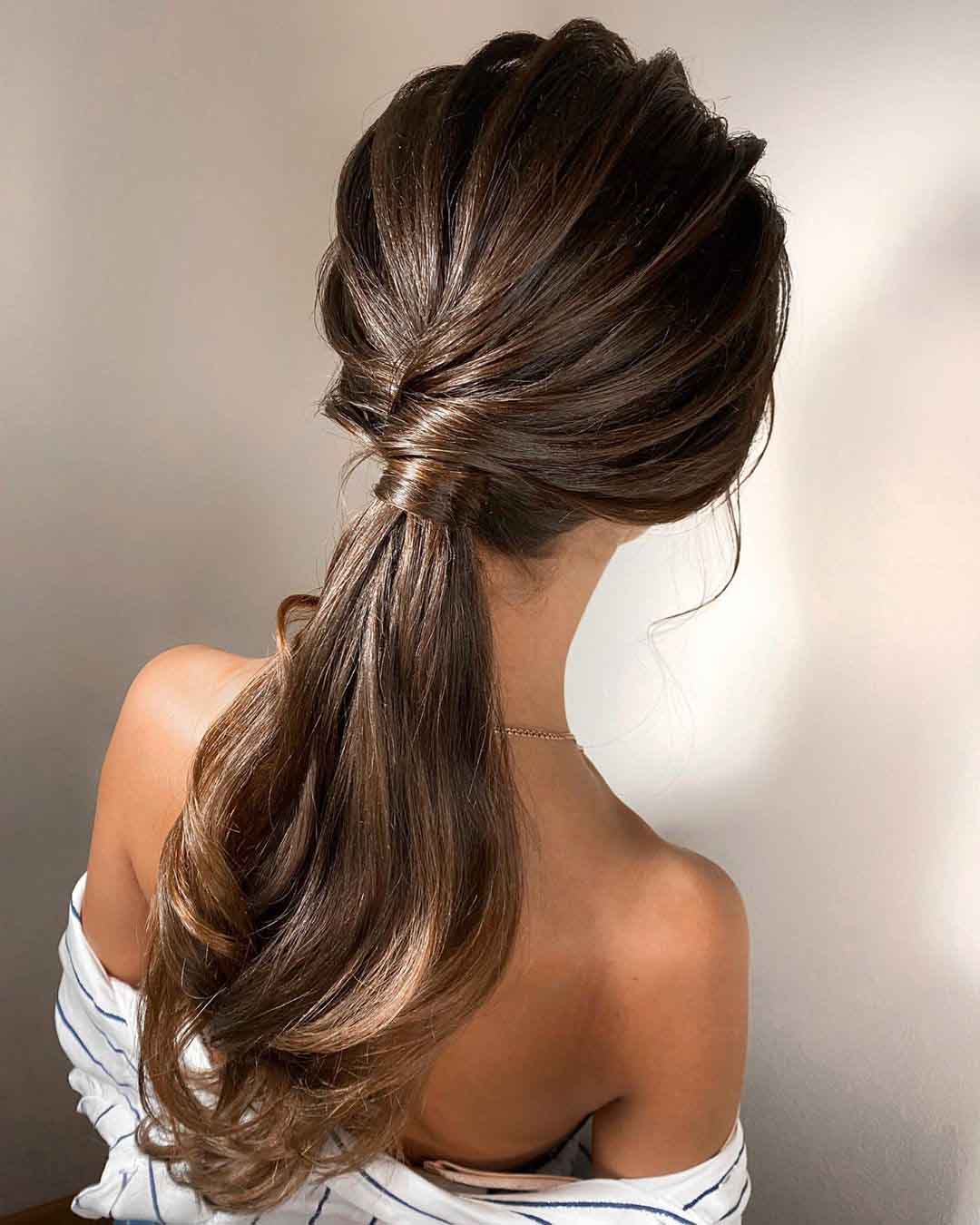 Это может быть строгий и гладкий хвост или небрежный и собранный вручную. Поверх резинки используйте необычные шпильки, ленточки или завяжите вокруг хвоста прядь волос, которую предварительно нужно оставить свободной. Также можно отпустить пару прядей по бокам. Не делайте их одинаковыми или симметричными: чем небрежнее, тем красивее.