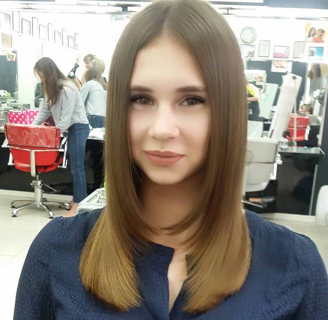 Расширить контуры дамам с узким лицом сможет прямая рваная челка. Можно поэкспериментировать с градуировкой и филированием, чтобы придать объема, визуально расширить черты.