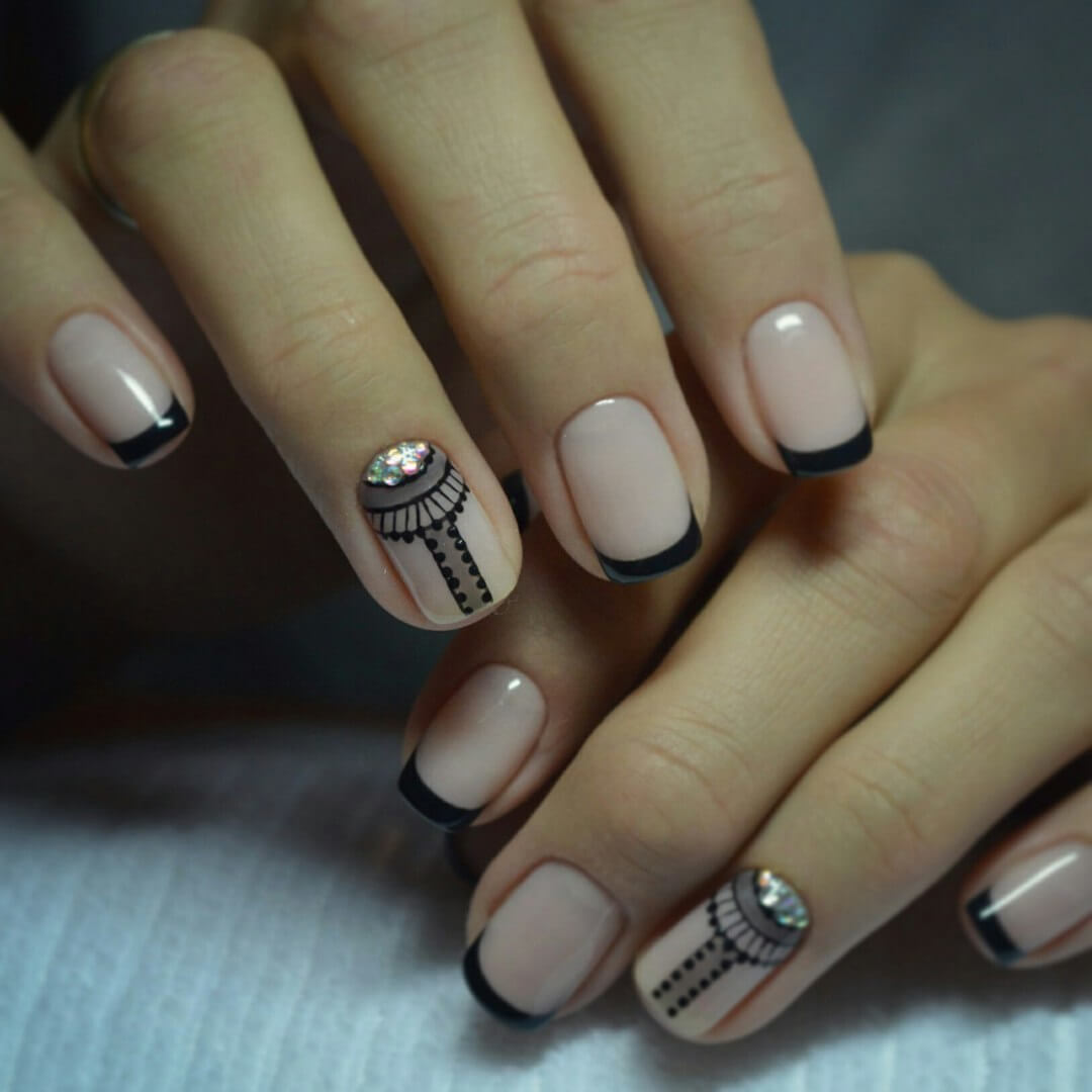 Декоративные акценты в черном маникюре позволяют сделать его более праздничным и заметным. Поэтому модницы выбирают блестки и стразы. Также популярностью пользуются фольгированный декор: камифубуки, скотч-лента, оттиски и многое другое.