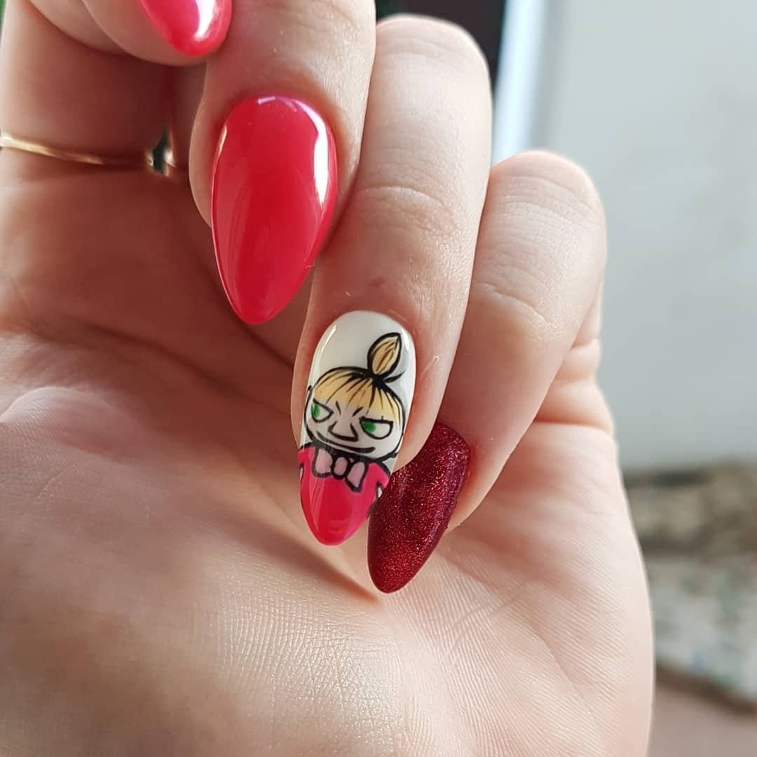 Для молодых модниц подойдут такие узоры для ногтей, как веселые рожицы. Рисуем на ногтях белые глаза-яички, ставим внутри точку-зрачок, и проводим линию-улыбку. Можно добавить высунутый красный язык, с помощью бровей сделать мордашку злой или подозрительной