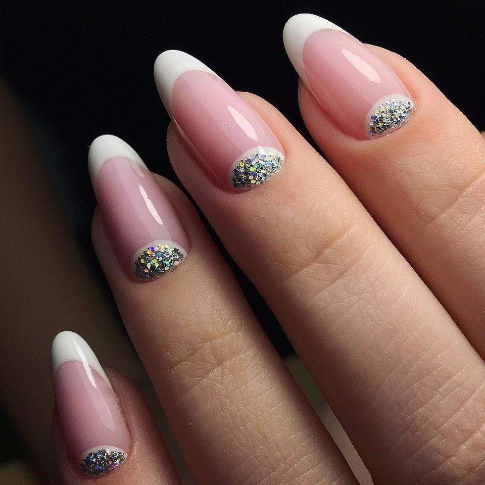 К примеру, разноцветный или жемчужный пигмент, который нанесён поверх оформления, даже в комбинации с бесцветной основой, делает классический френч более интересным, свежим и невесомым.