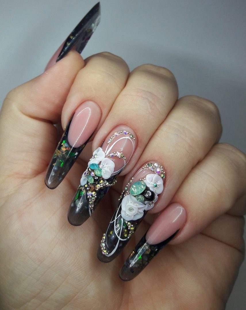 Выбирая дизайн, учитывайте, что длинные черные ногти сами по себе будут привлекать внимание окружающих, и отдавайте предпочтение более разбавленным дизайнам. Таким как глиттер, геометрия, минимализм, френч, лунки