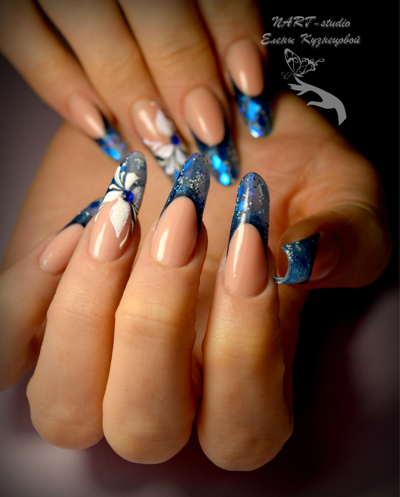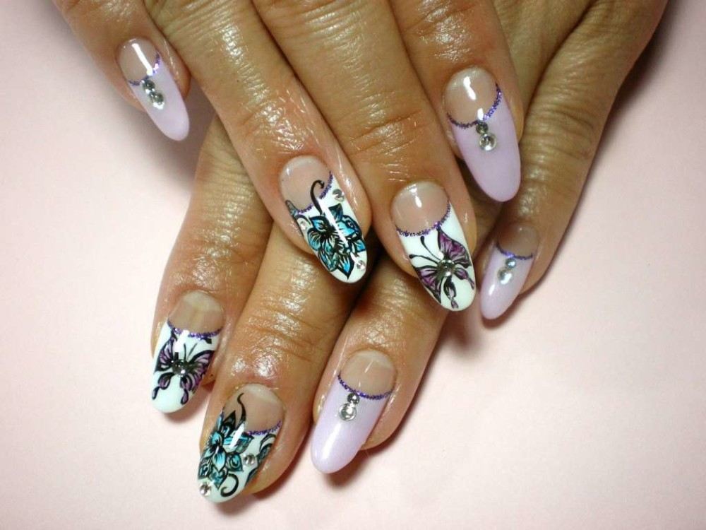 Это может быть линия со стразами, пересекающая поверхность, или ромб из блесток у ее основания. Заслуживает внимания и использование декоративных материалов в нейл-арте: несколько стразов, расположившихся на крыльях, отлично дополнят рисунок бабочки.