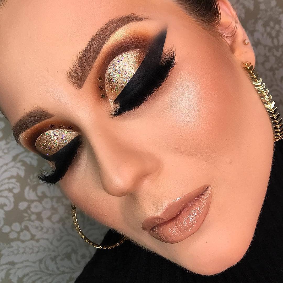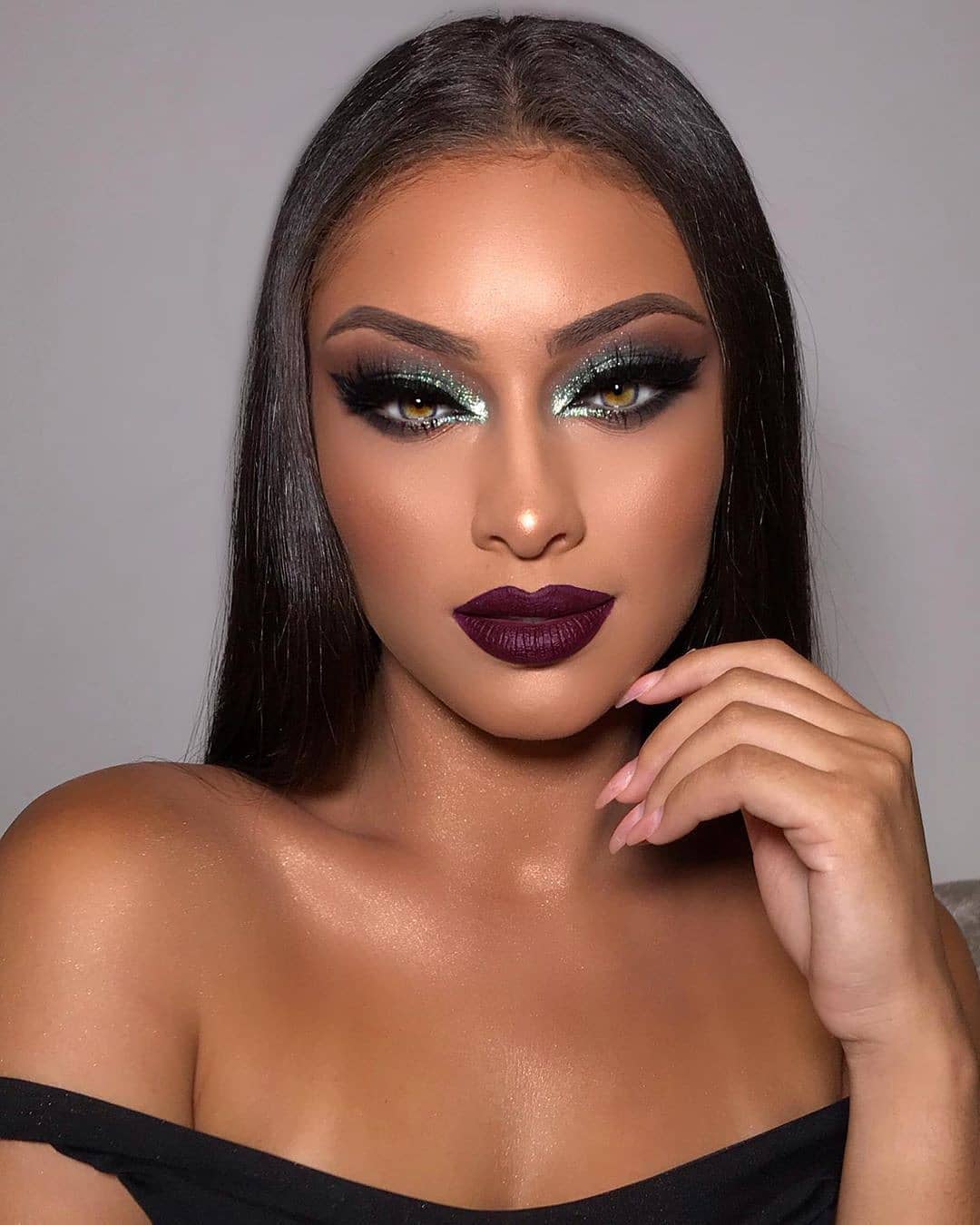 Блестящий темный макияж содержит в себе мелкие либо крупные блестки. Тени с добавлением глиттера превосходно украсят вас для любого праздника. Вы также можете использовать золотые и серебряные тени с глиттером, но всегда подчеркивать их черными стрелками.
