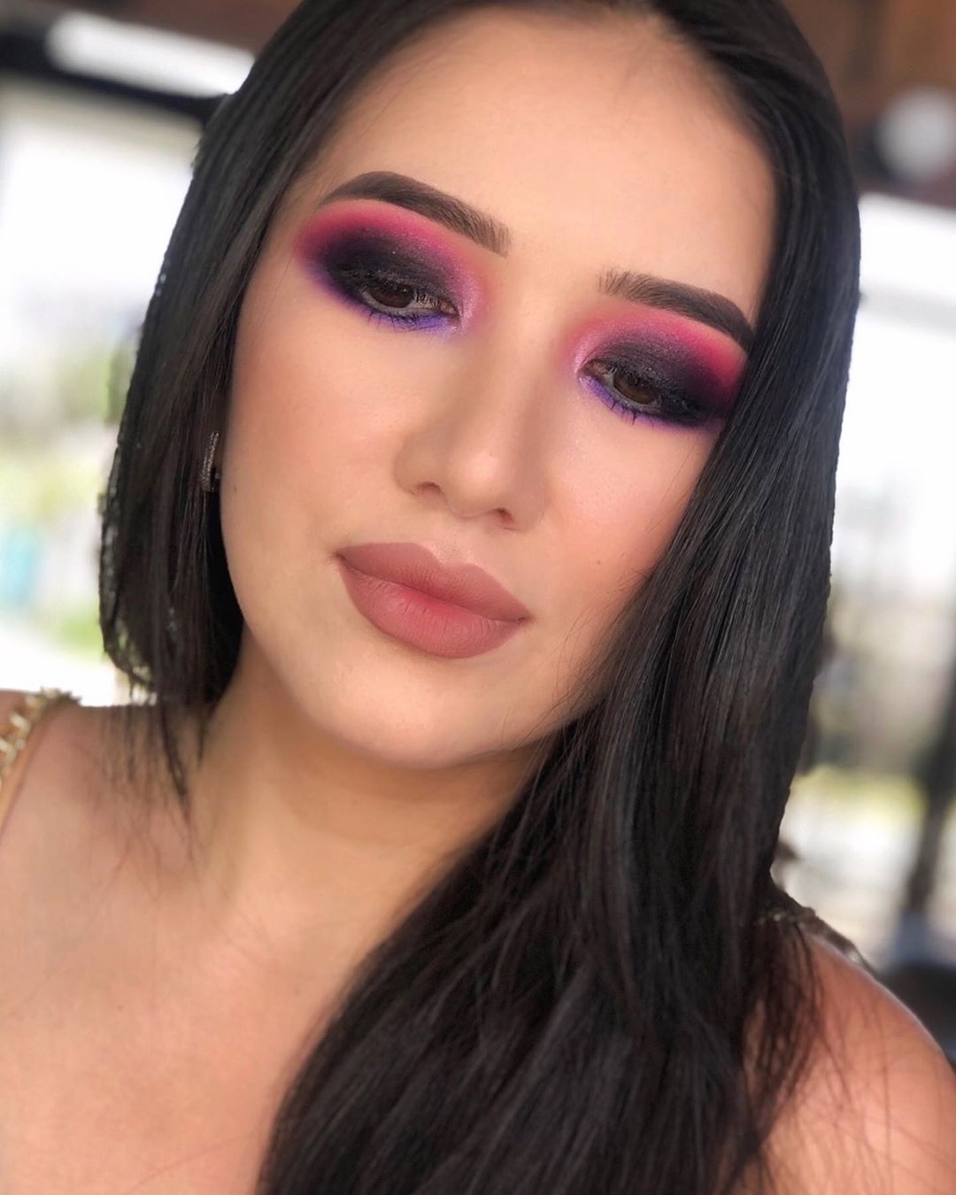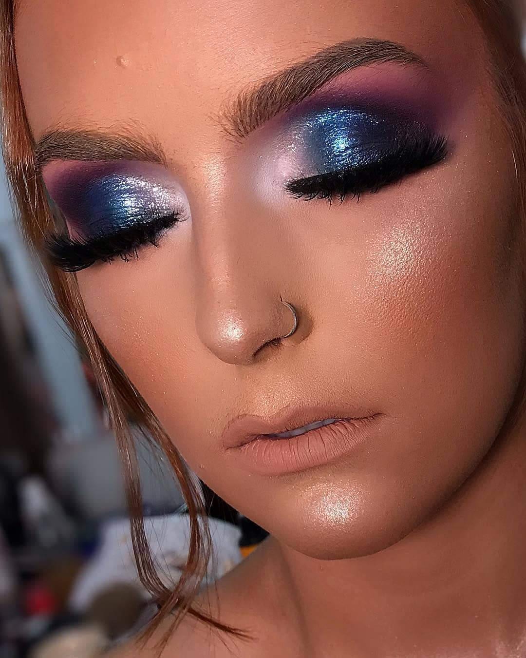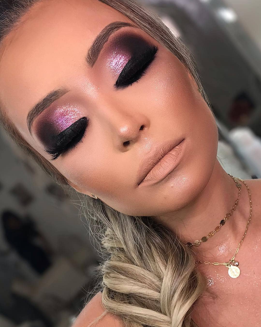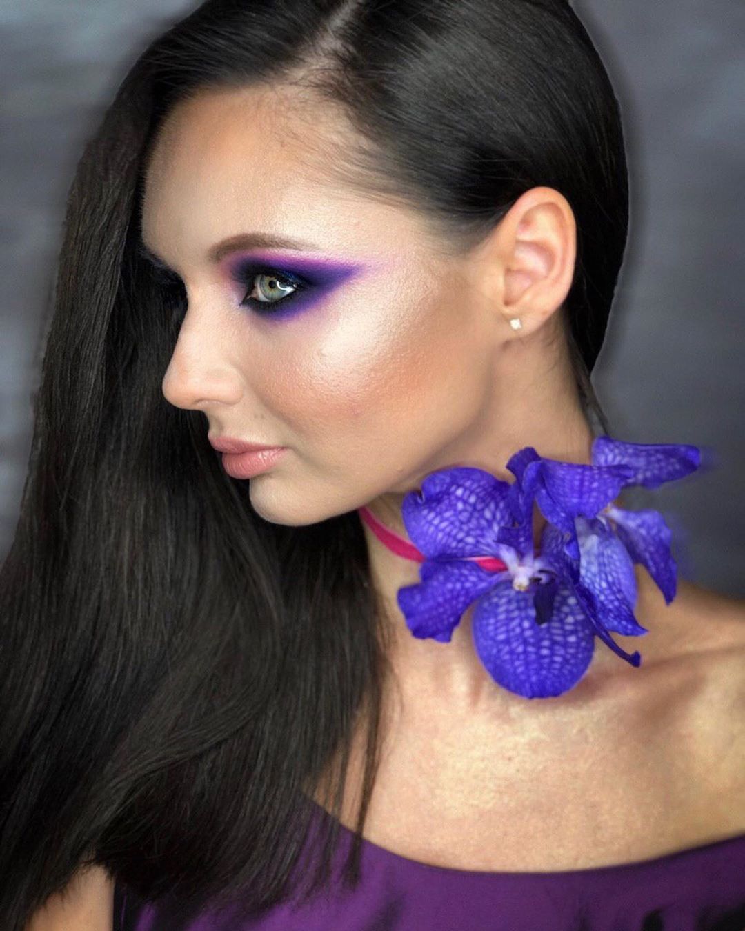 В зависимости от интенсивности теней и наличия накладных ресниц такой макияж может получиться как дневным, так и вечерним. Насыщенный фиолетовый пигмент с добавлением блёсток отлично подойдёт для новогодней ночи.