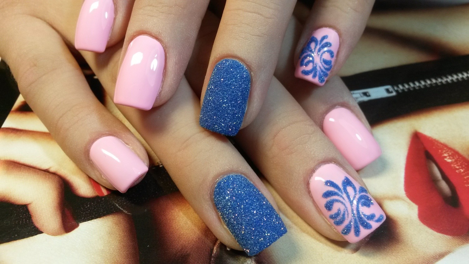 Процесс нанесения декоративного песка не отличается от использования флока. Благодаря мелкой текстуре песок часто используется для создания «вязаных» узоров на ногтях в нежных розовых или голубых оттенках.