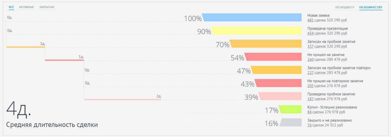 Анализ эффективности. Cистема соберет данные и подготовит отчет по основным бизнес-метрикам. Например: KPI — ключевые показатели эффективности менеджеров, POI — окупаемость инвестиций, LTV — пожизненная стоимость клиента. Программа анализирует воронку по этапам и показывает слабые места.