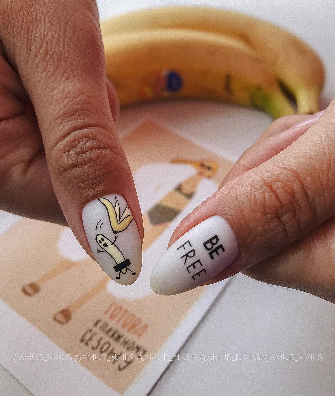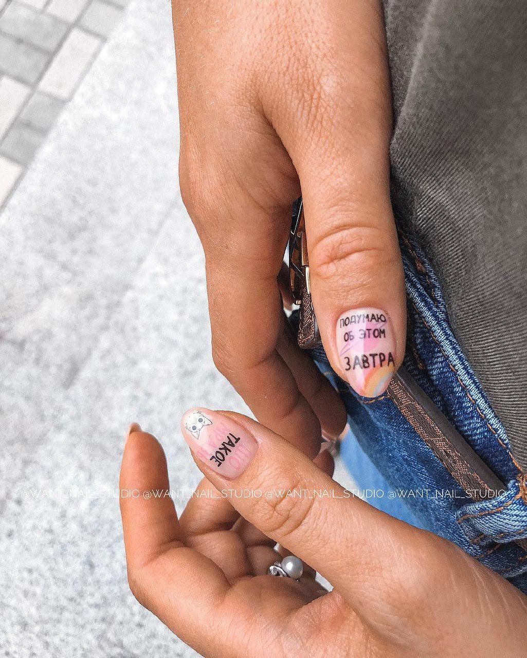 Выполнить маникюр со смешными надписями готова не каждая девушка. Такой дизайн явно выглядит неординарно и непривычно. Но если вы готовы быть объектом пристального внимания, то без опасений выполняйте на своих ноготках смешные надписи.
