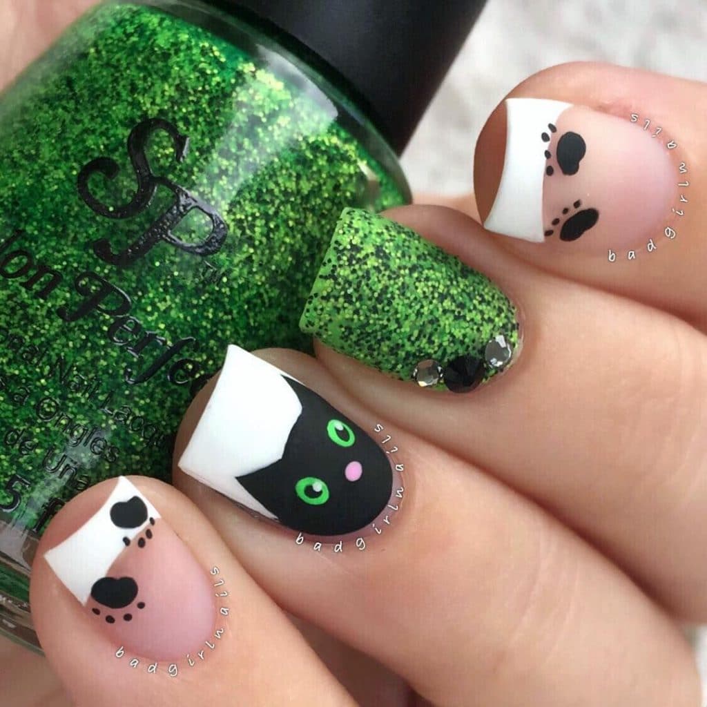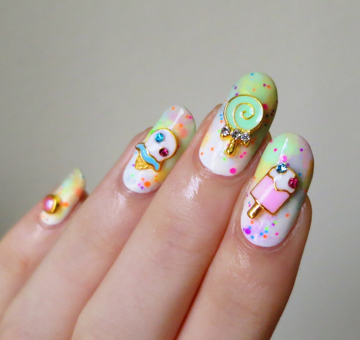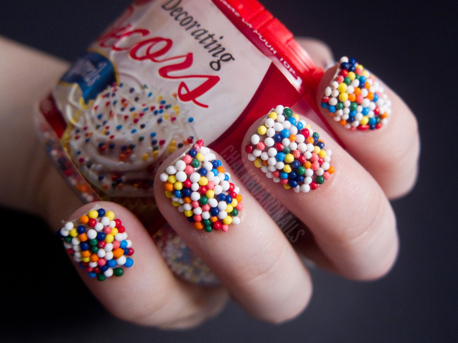 Веселый маникюр можно создать также с помощью флока, бульонок и другого объемного декора