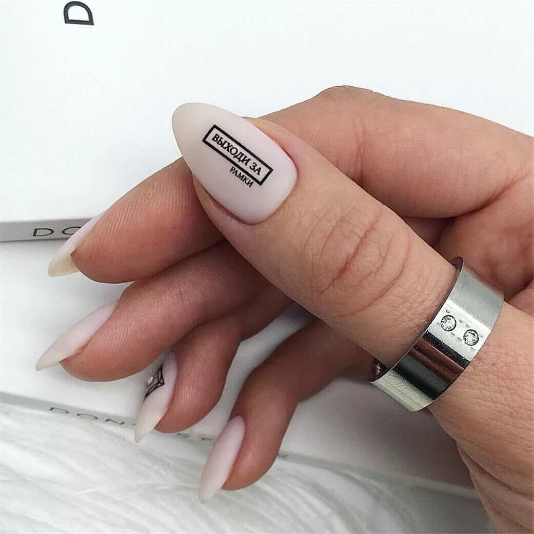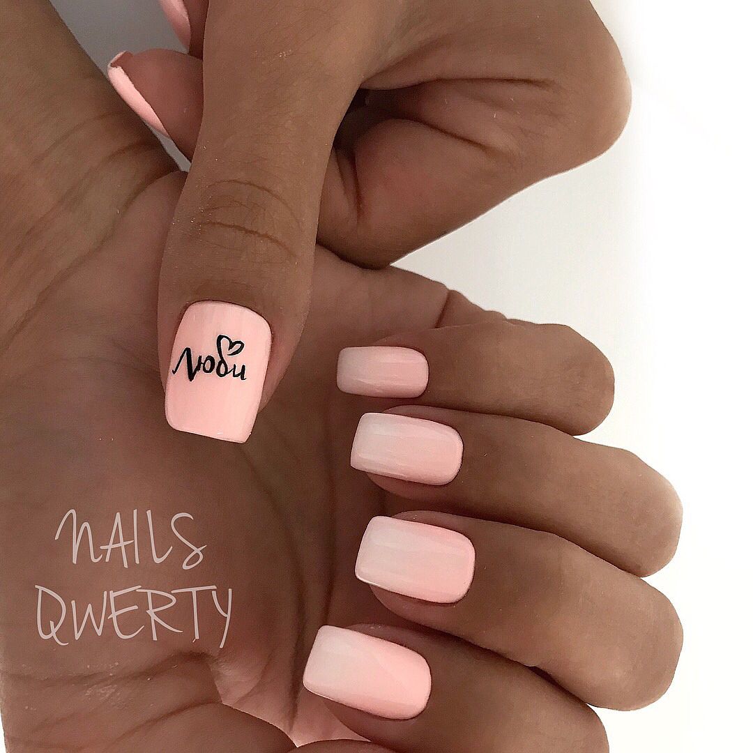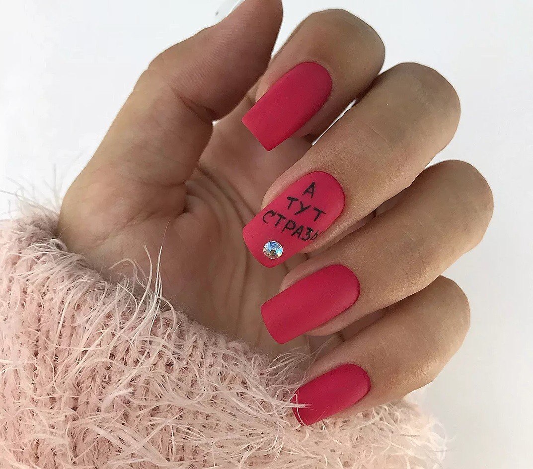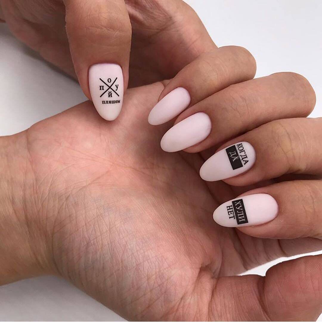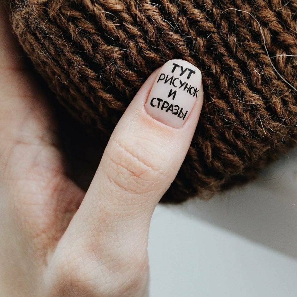Надписи на русском языке смотрятся не менее привлекательно, чем привычные Love и другие. Изобразите на ногтях любой слоган, который вдохновляет и греет вас. Это могут быть ваши с молодым человеком инициалы, мотивирующие надписи, слоганы, поднимающие настроение и т.д.