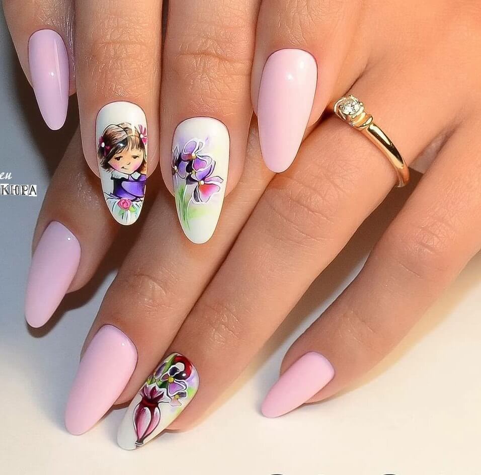 Великолепно смотрятся полевые цветы, чайные розы, рисунки с бабочками и другими насекомыми. Присмотритесь к нейл-артам с белоснежными ромашками и весенними тюльпанами. Розы в весеннем маникюре встречаются редко, они уместнее смотрятся в осеннем нейл-арте в бордовом цвете.
