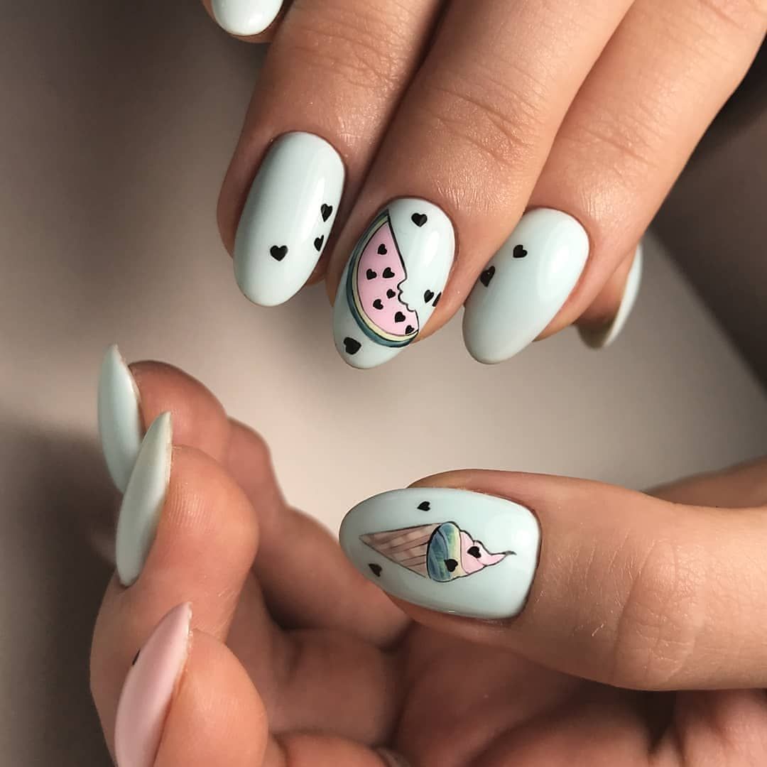 Основной акцент в веселом маникюре сделан на рисунке. Именно он задает тон всему дизайну, наделяет его смыслом. О том, какие узоры можно разместить на ноготках, мы поговорим ниже.