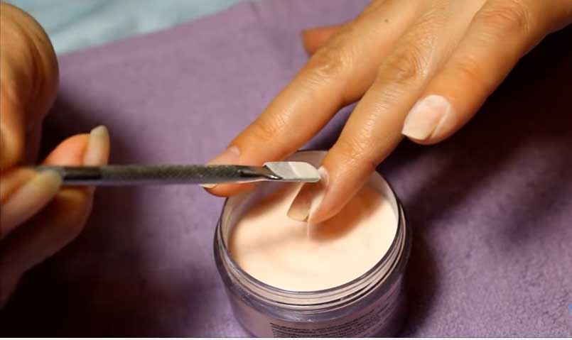 Перед тем, как вы будете наносить пудру, вам необходимо покрыть натуральный ноготь праймером и ненадолго оставить, чтоб он подсох.Благодаря этому действию акрил легче ляжет на поверхность.