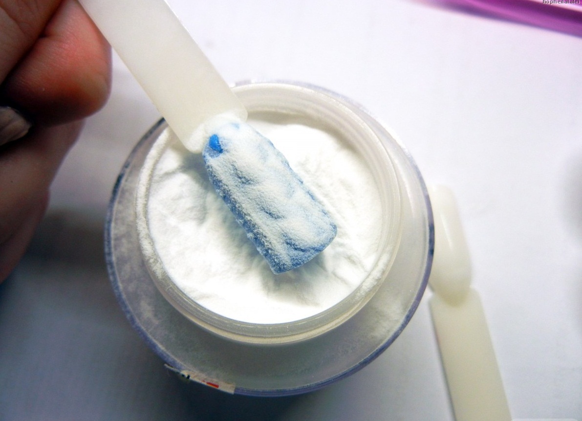 Далее остается удалить аккуратно щеточкой излишки пудрой. Так как акрил в таком виде очень легкий, сыпучий, лучше проводить процедуру непосредственно над банкой с порошком. Тогда частички будут сыпаться обратно в емкость.