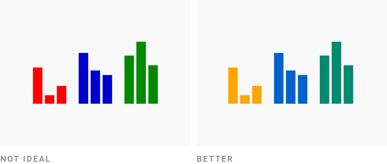 Чтобы ваши цвета выглядели более естественными и приятными для глаз читателей, вы можете либо уменьшить насыщенность чистых цветов, либо сделать их темнее. Если вы хотите получить яркие, насыщенные цвета, полагайтесь на смешанные цвета на расстоянии не менее 5-10° от чистых цветов.