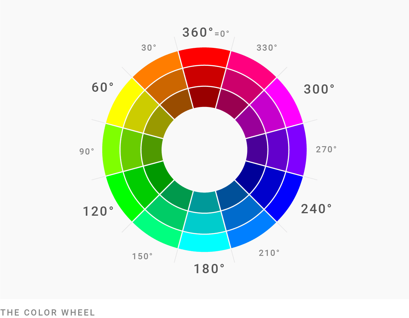 «Чистые» оттенки — это те, которые расположены точно под 60°, 120°, 180°, 240°, 300° и 360°/0° на цветовом круге: