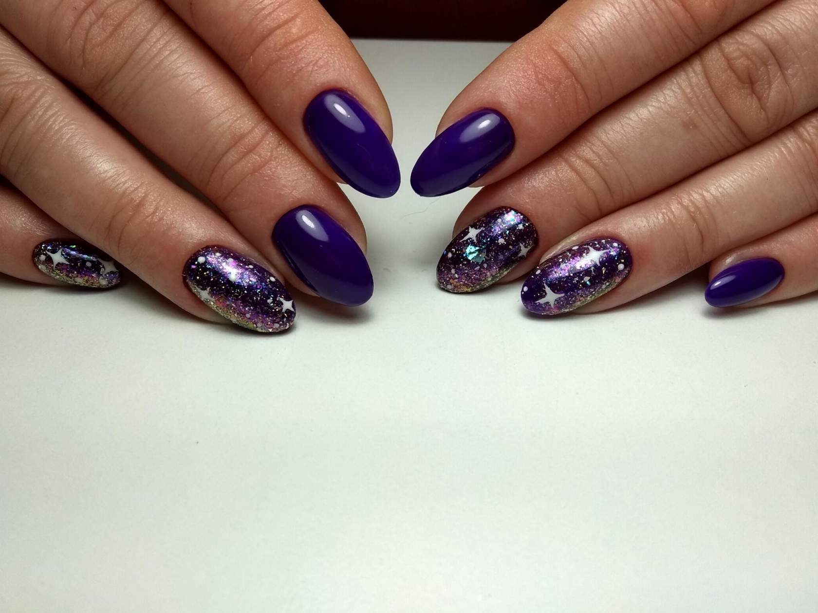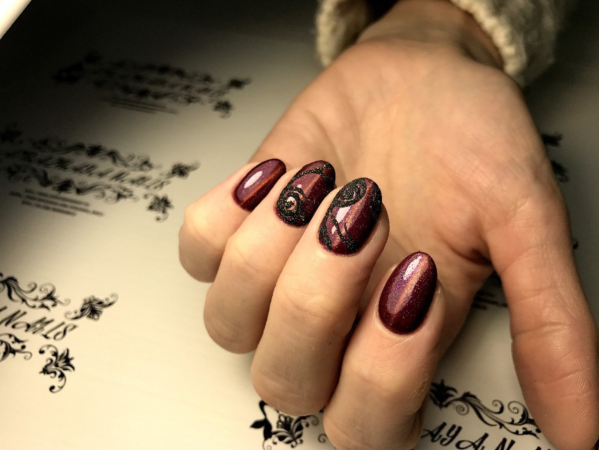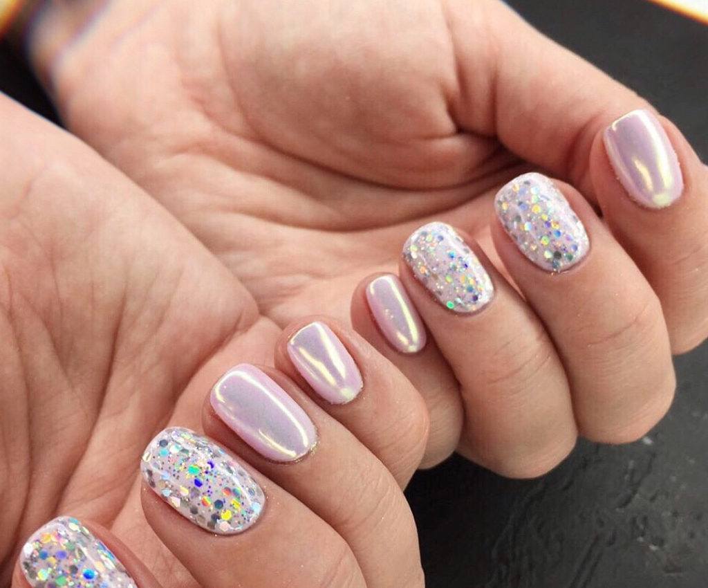 Очень красиво смотрится на ногтях витражный, зеркальный гель-лак и покрытие с блёстками.