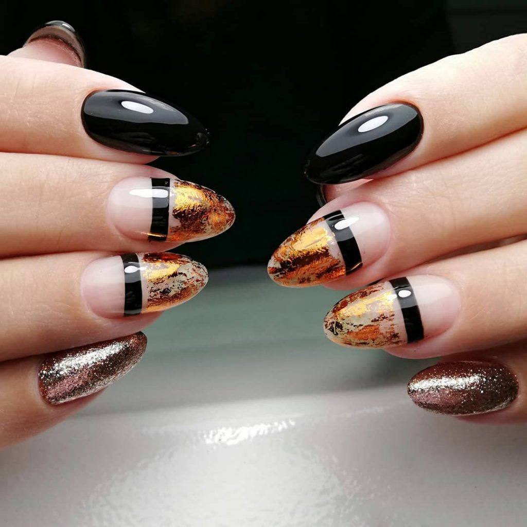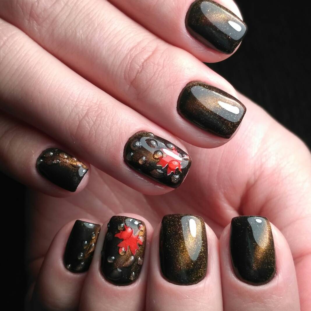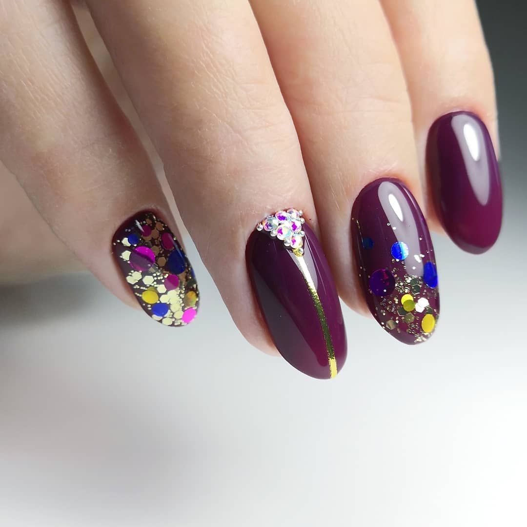 Очень красиво смотрится на ногтях витражный, зеркальный гель-лак и покрытие с блёстками.