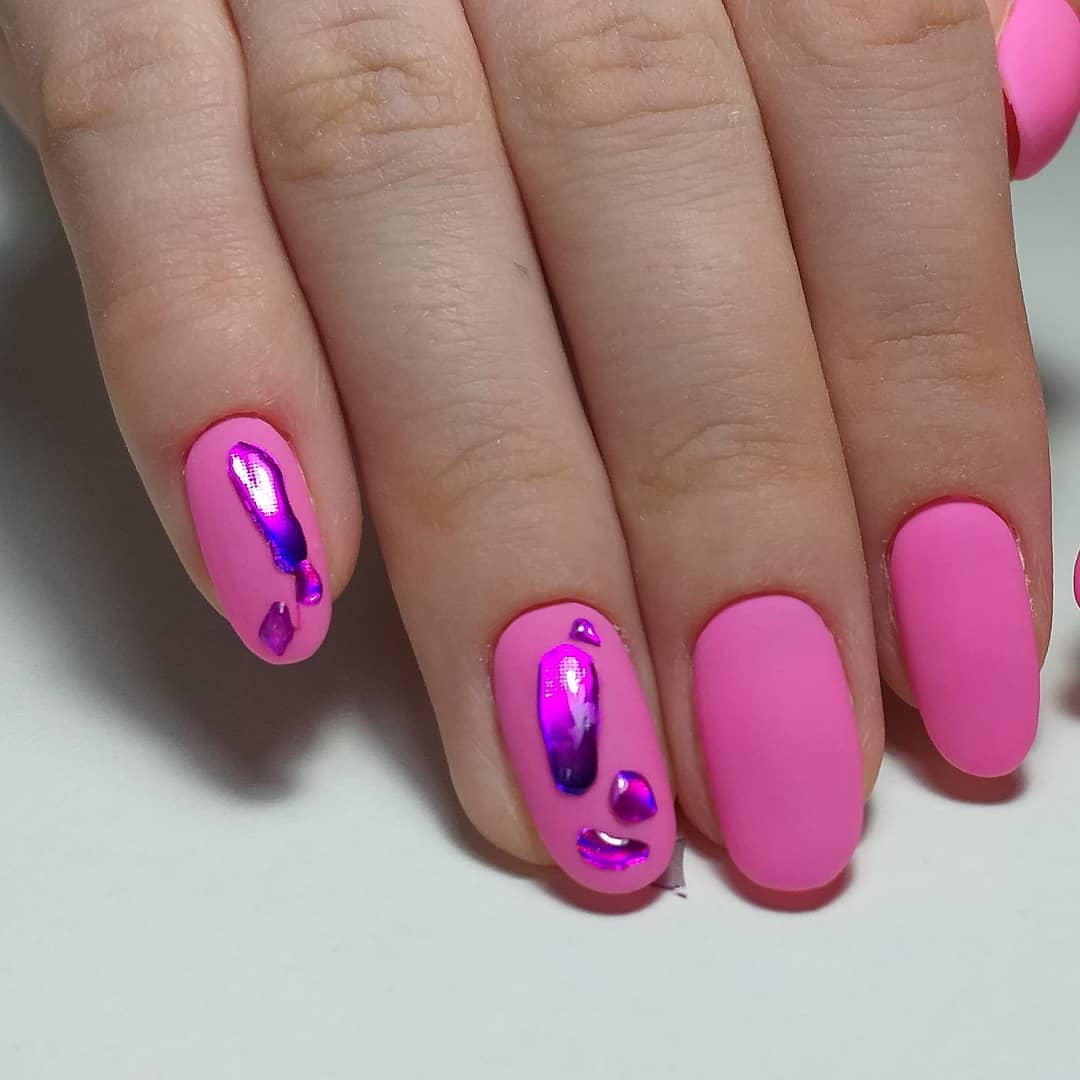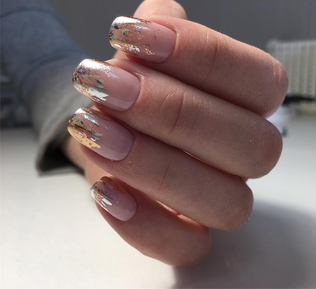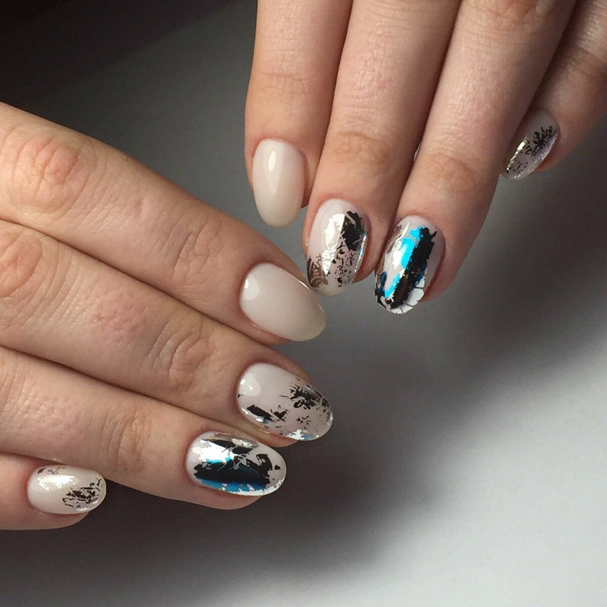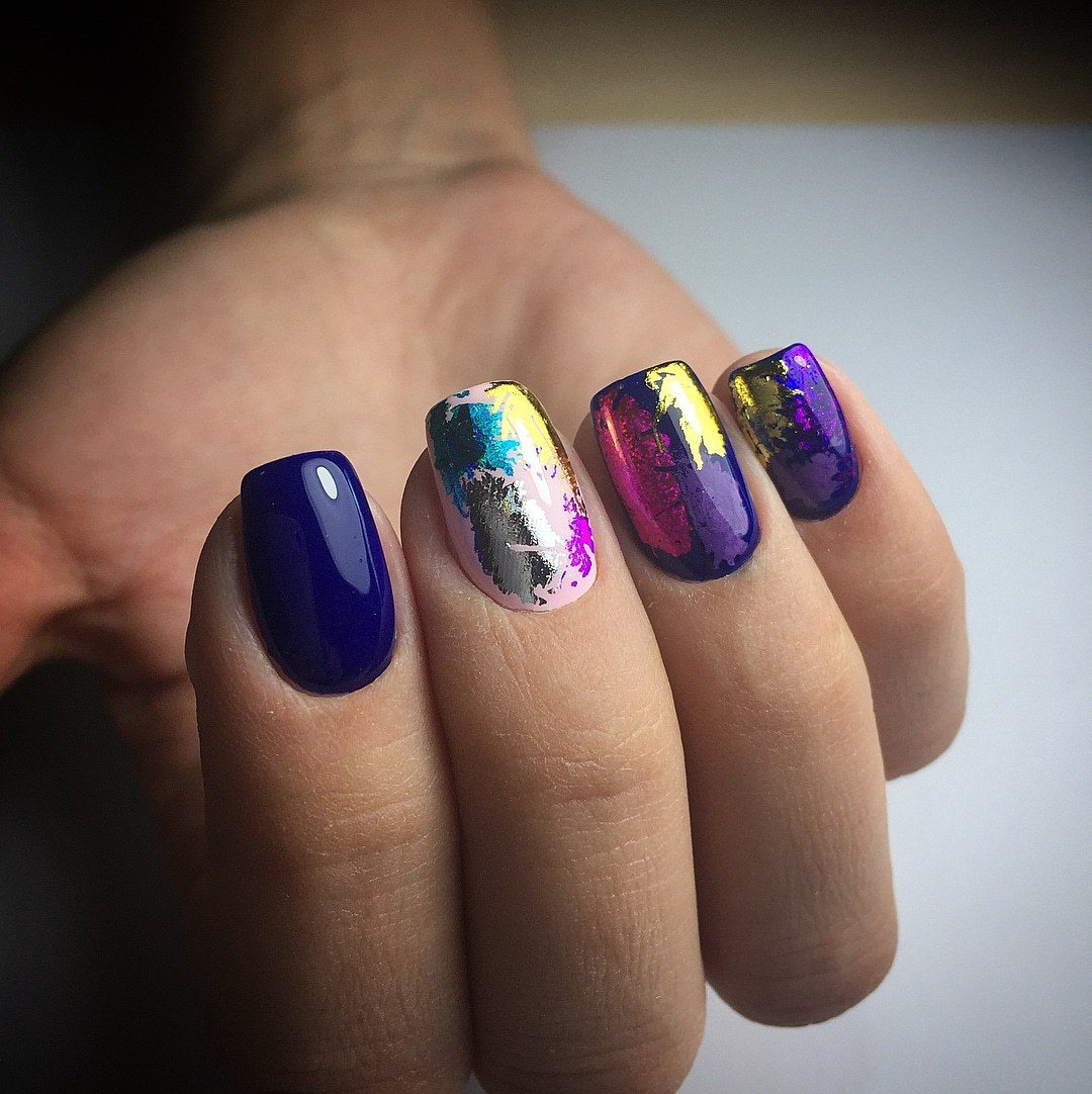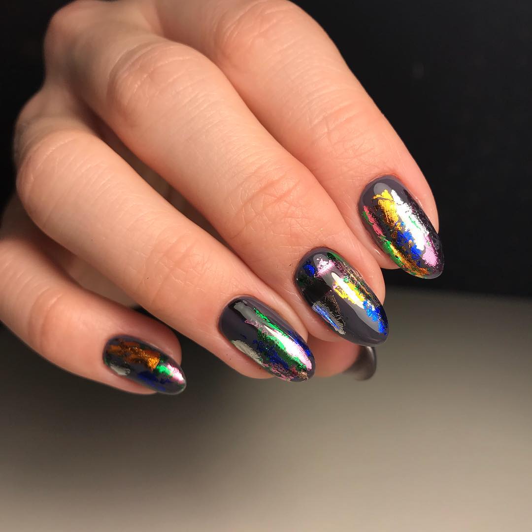 Необычный дизайн в стиле “слезы единорога” достаточно быстро стал популярным. В процессе оформления используются небольшие кусочки фольги, которые приклеивают поверх основного покрытия. Смотрится такой дизайн оригинально и точно не останется без внимания.