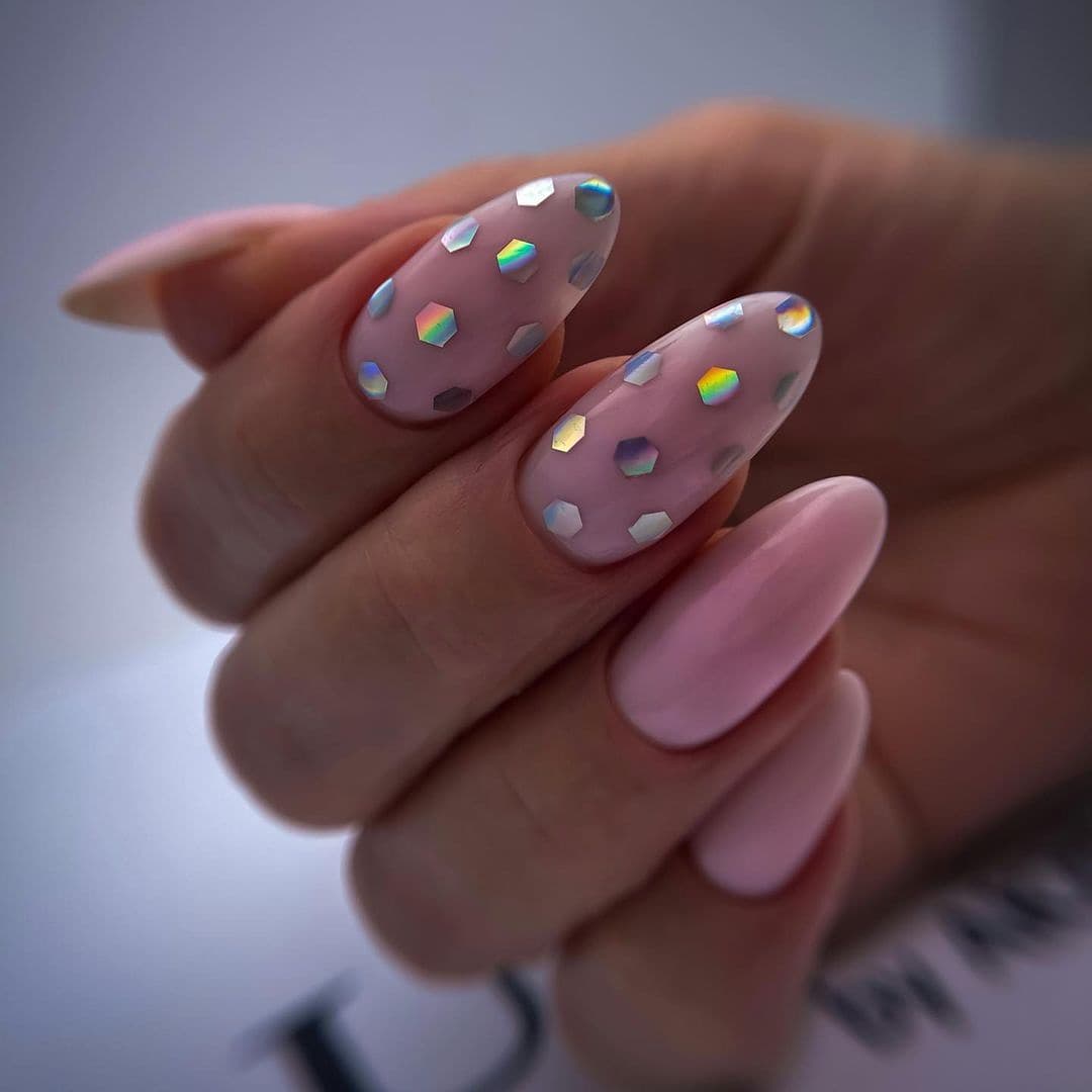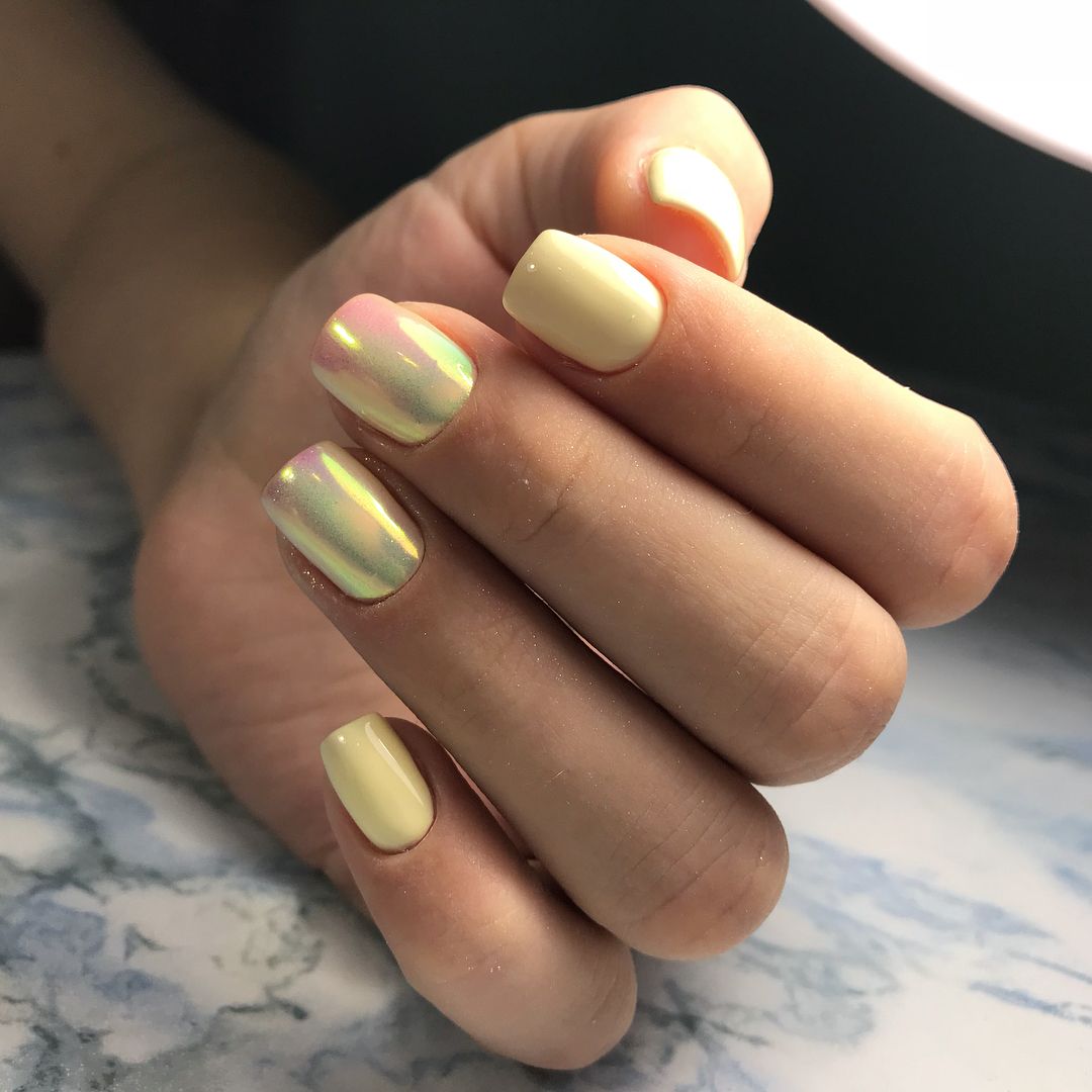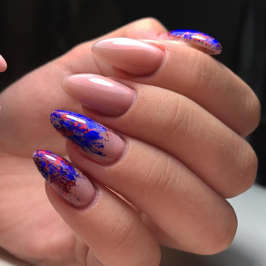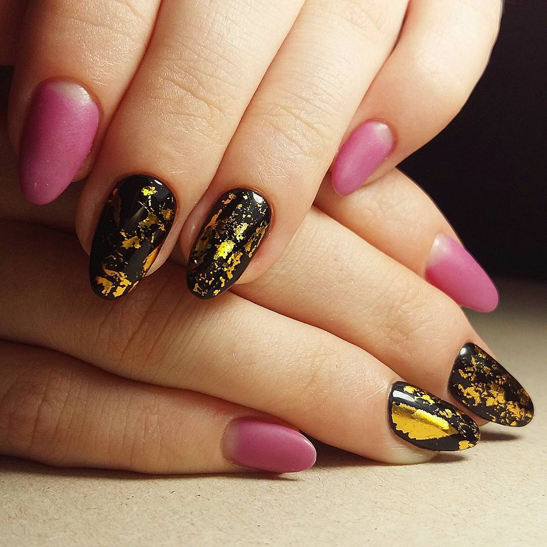 Необычный дизайн в стиле “слезы единорога” достаточно быстро стал популярным. В процессе оформления используются небольшие кусочки фольги, которые приклеивают поверх основного покрытия. Смотрится такой дизайн оригинально и точно не останется без внимания.