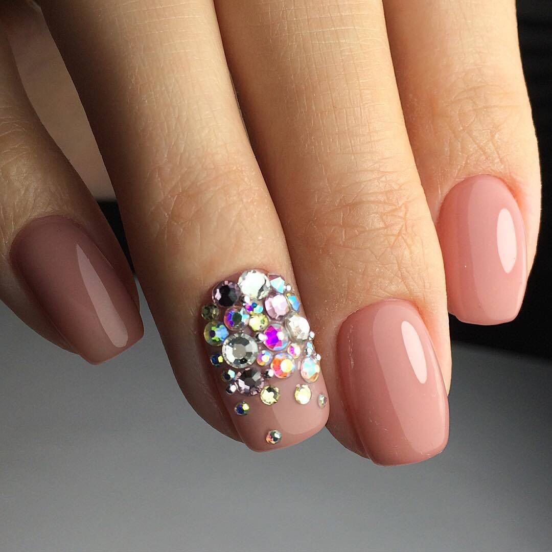 Однотонное покрытие всегда можно украсить несколькими стразами. Благодаря чему маникюр будет лаконичным, но в то же время более ярким. Любительницам более заметного дизайна можно смело украшать один-два ноготка более плотным слоем декора. В целом его количество зависит только от ваших личных предпочтений.