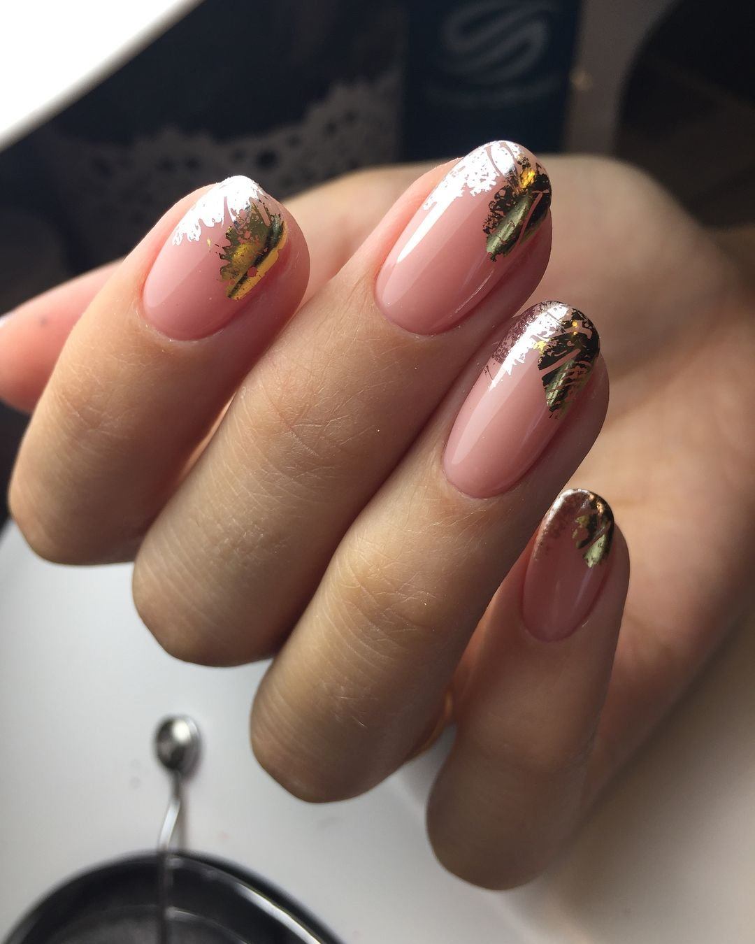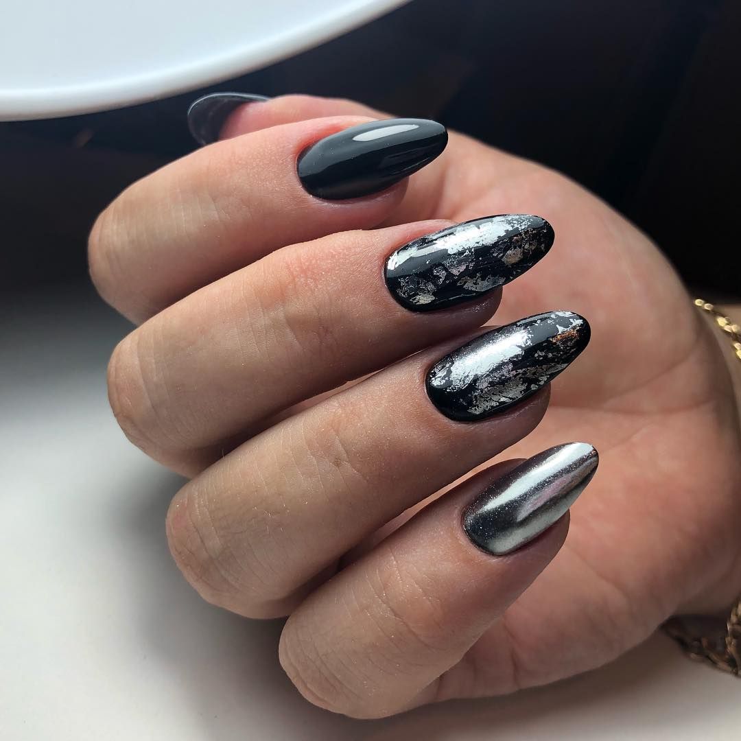 Фольга — самый трендовый вариант декора ногтей. Для выполнения праздничного дизайна пригодятся эти очень тонкие металлические пластины. Они могут быть разных оттенков: платинового, золотого, медного, изумрудного, рубинового и других. Если аккуратно нанести на покрытие один элемент из фольги, то можно получить красивый переливающийся орнамент разных форм и очертаний.