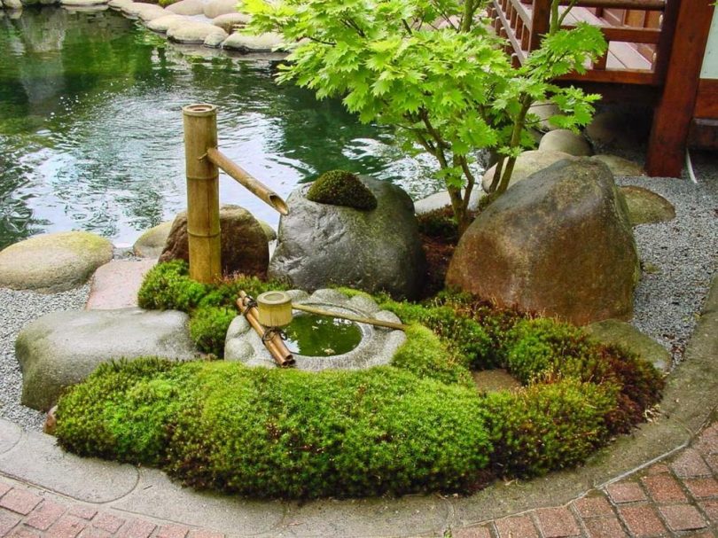 Еще одним типично японским элементом дизайна является цукубаи. Это небольшая чаша из камня округлой формы, к которой по бамбуковой трубке поступает вода и стекает под чашу в дренаж. Цукубаи предназначена для чайной церемонии. В ней не моют руки, воду из нее зачерпывают специальным бамбуковым ковшиком. В европейских садах, стилизованных под Японию, цукубаи выполняют декоративную функцию.