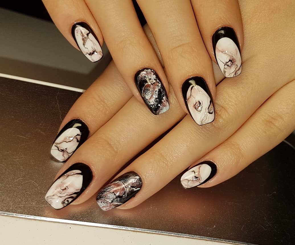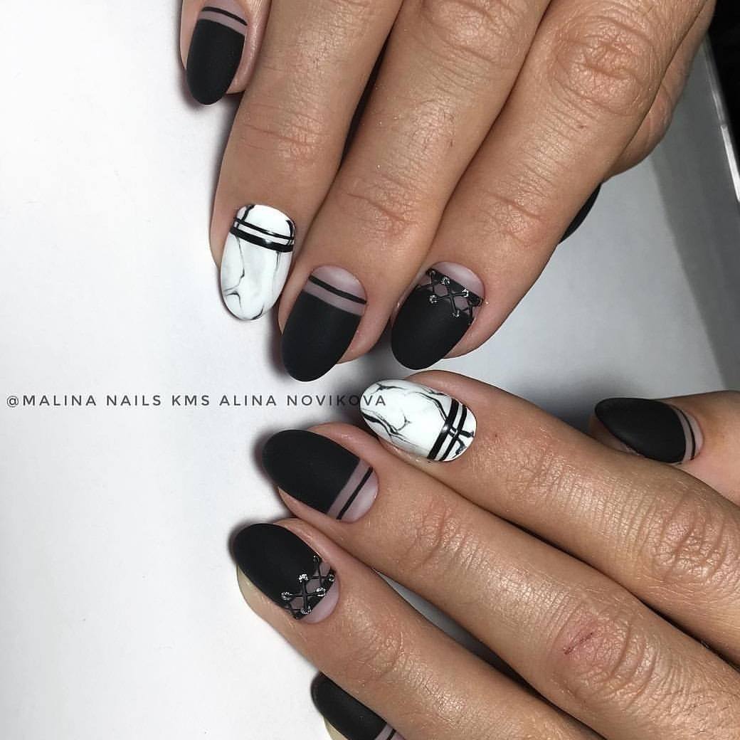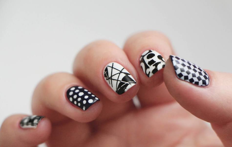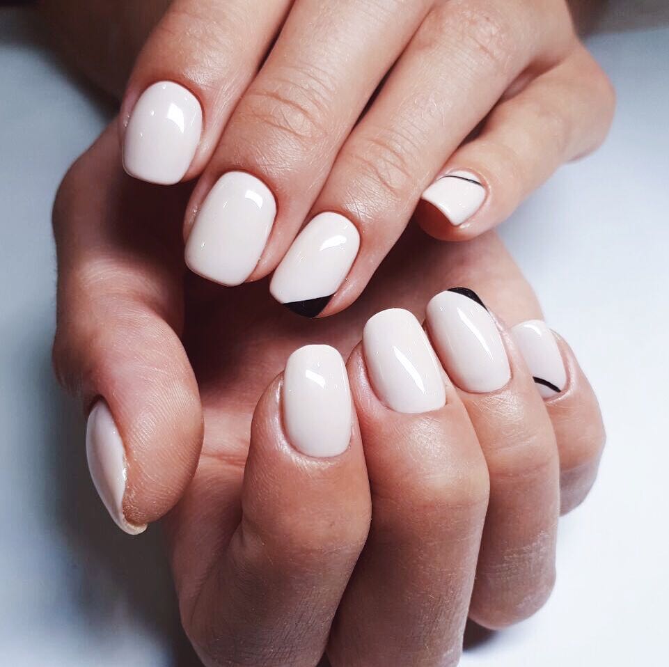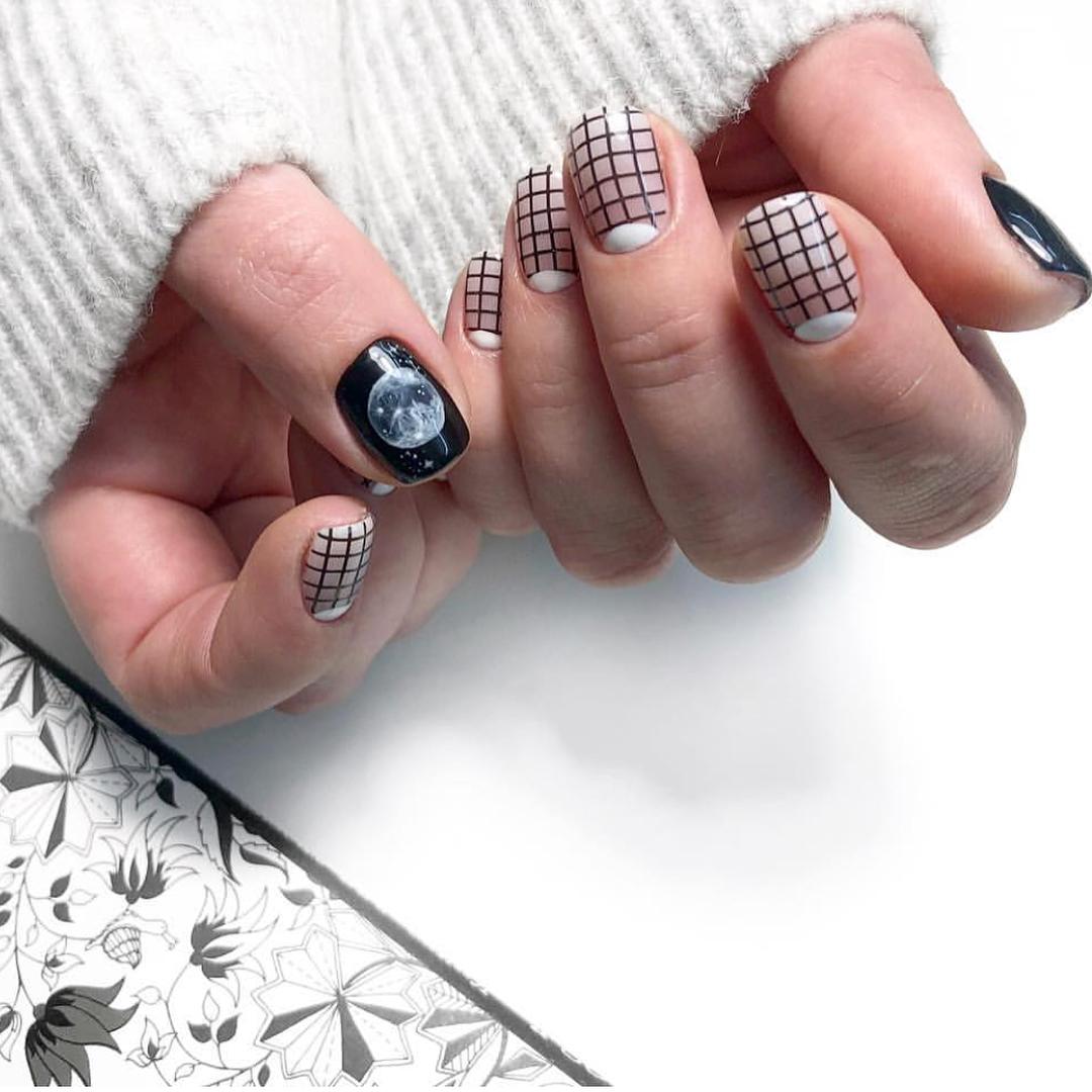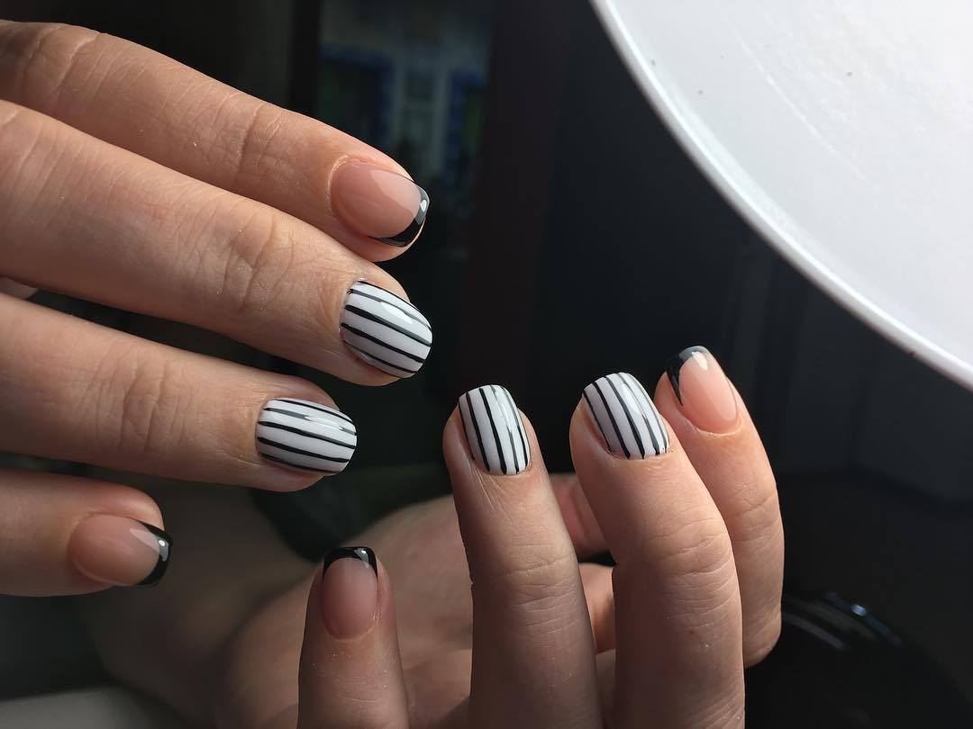 На коротких ногтях выигрышно выглядят как вертикальные, так и горизонтальные полоски. Абстракции с кругов, а также милые бело-черные разводы с прозрачными островками, сквозь которые отчетливо можно увидеть ногтевую пластину.