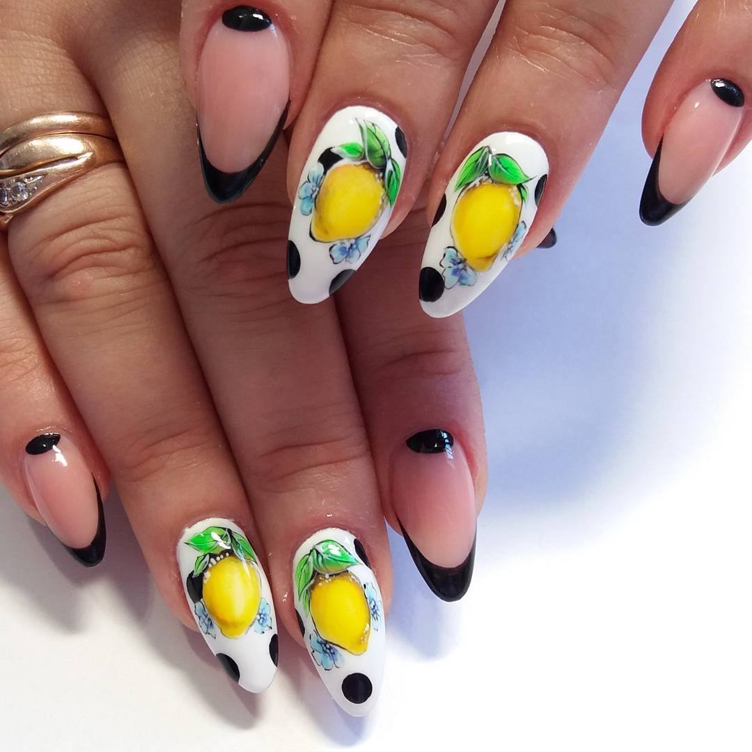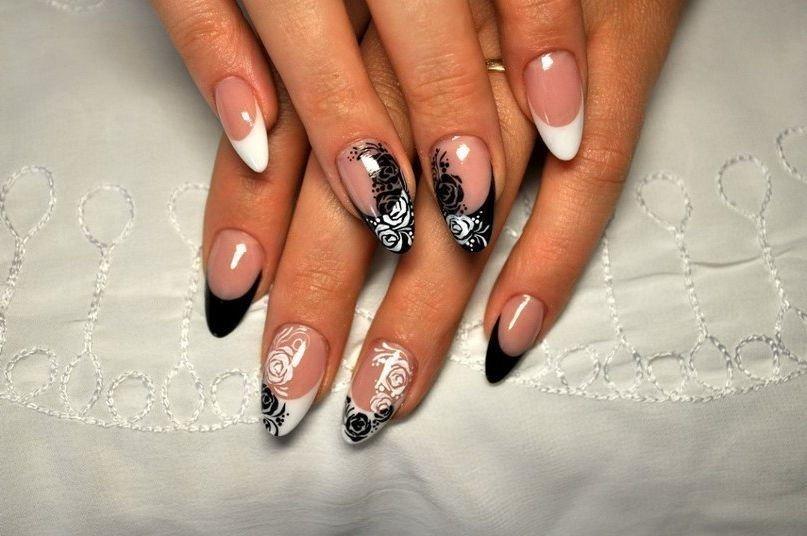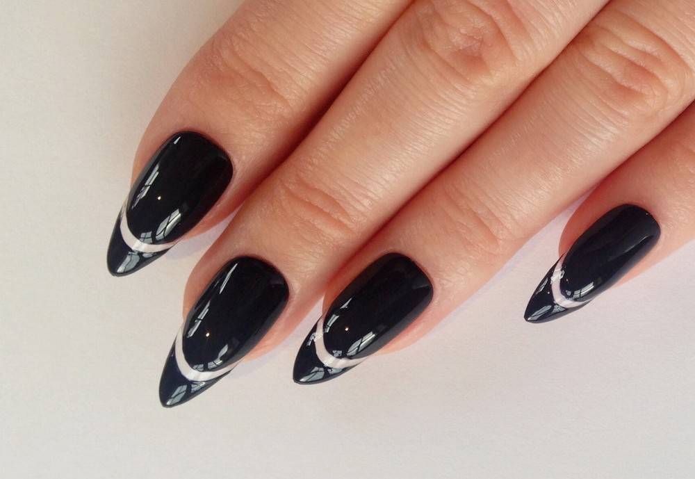 Не все дамы отдают предпочтение острой форме ногтей. Она считается не очень удобной и не особо практичной, но всё равно занимает лидирующие позиции в мире моды. У заострённых ноготков есть свои поклонницы, которые восхищаются своими ноготками и придумывают им необыкновенный дизайн. Для того, чтобы подчеркнуть и выделить данную форму, мастера салонов предлагают использовать чёрно – белый френч. Очень экстравагантно смотрятся такие ноготки с белой полоской ниже середины пластины. Также отличным вариантом считают тоненькие белые улыбочки на самом краю или широкая улыбка почти до середины ногтя, выполненная в форме дуги. Ажурные росписи, различные элементы декора в ненавязчивом нанесении, умело подчеркнут изюминку вашего маникюра.
