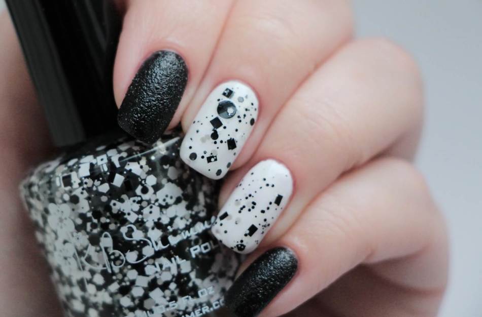 В таком случае блестки можно использовать, но также в небольшом количестве. Преимущественно их можно увидеть вместо точек или же на поверхности некоторых из линий. Для этого лучше использовать специальный лак, в составе которого уже содержаться блестки. Благодаря этому процесс оформления не займет много времени.