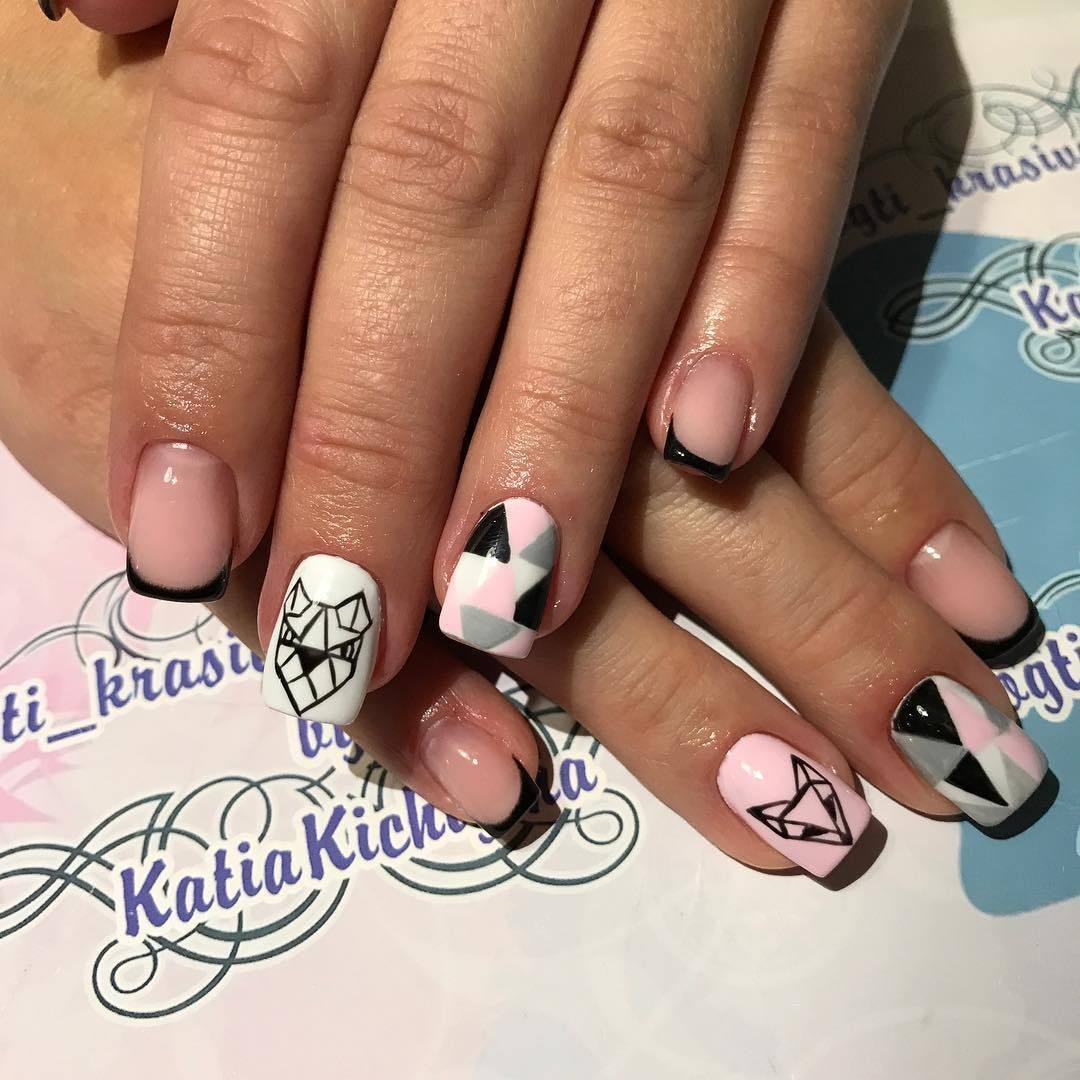 Часто сочетают французский маникюр с геометрическими и абстрактными рисунками, что смотрится стильно и создает впечатление скромной и сдержанной девушки.