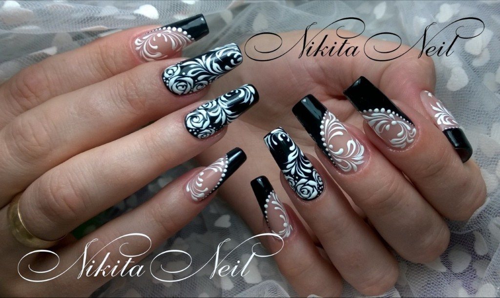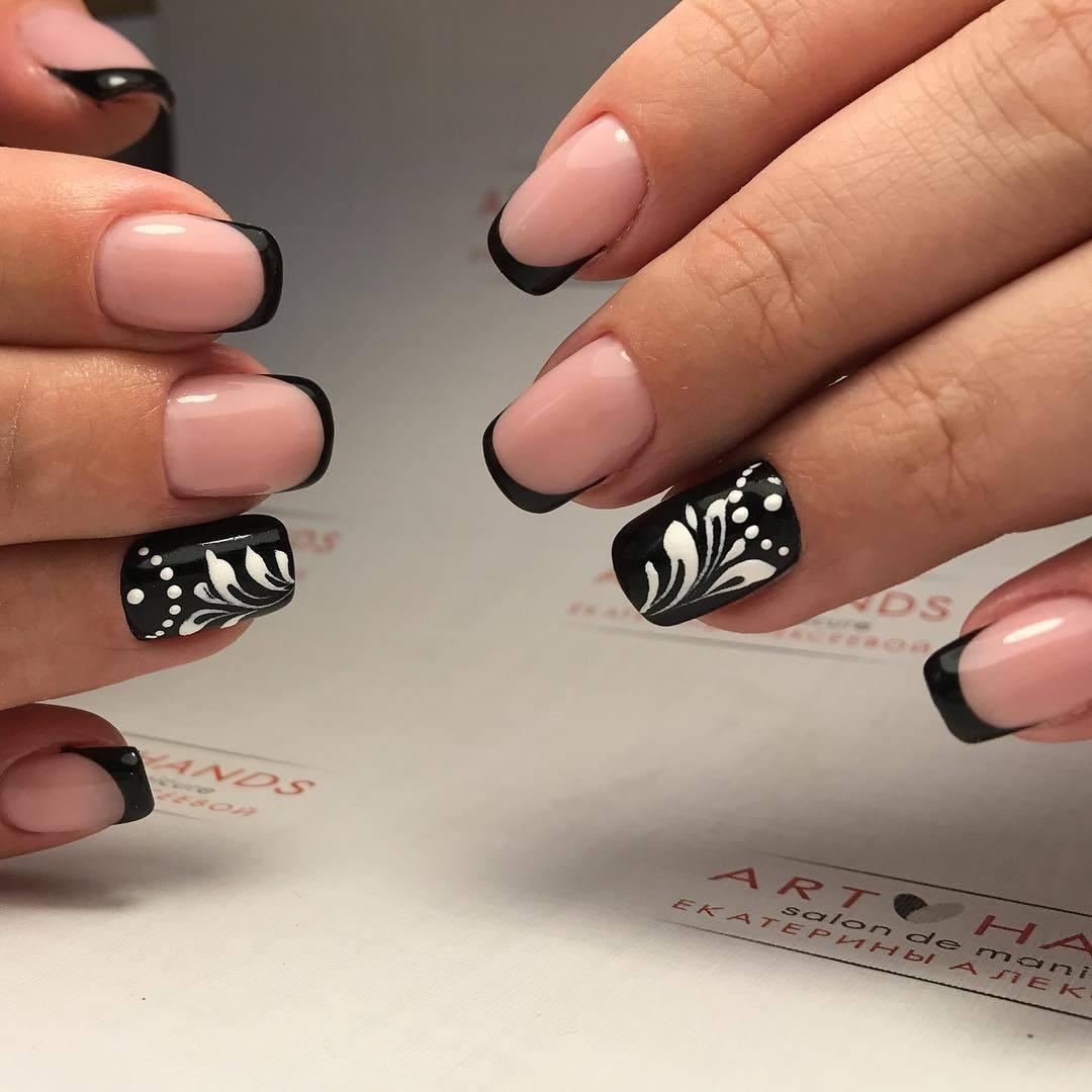 Варианты черно-белого френча с красивым узором на короткие и длинные ногти