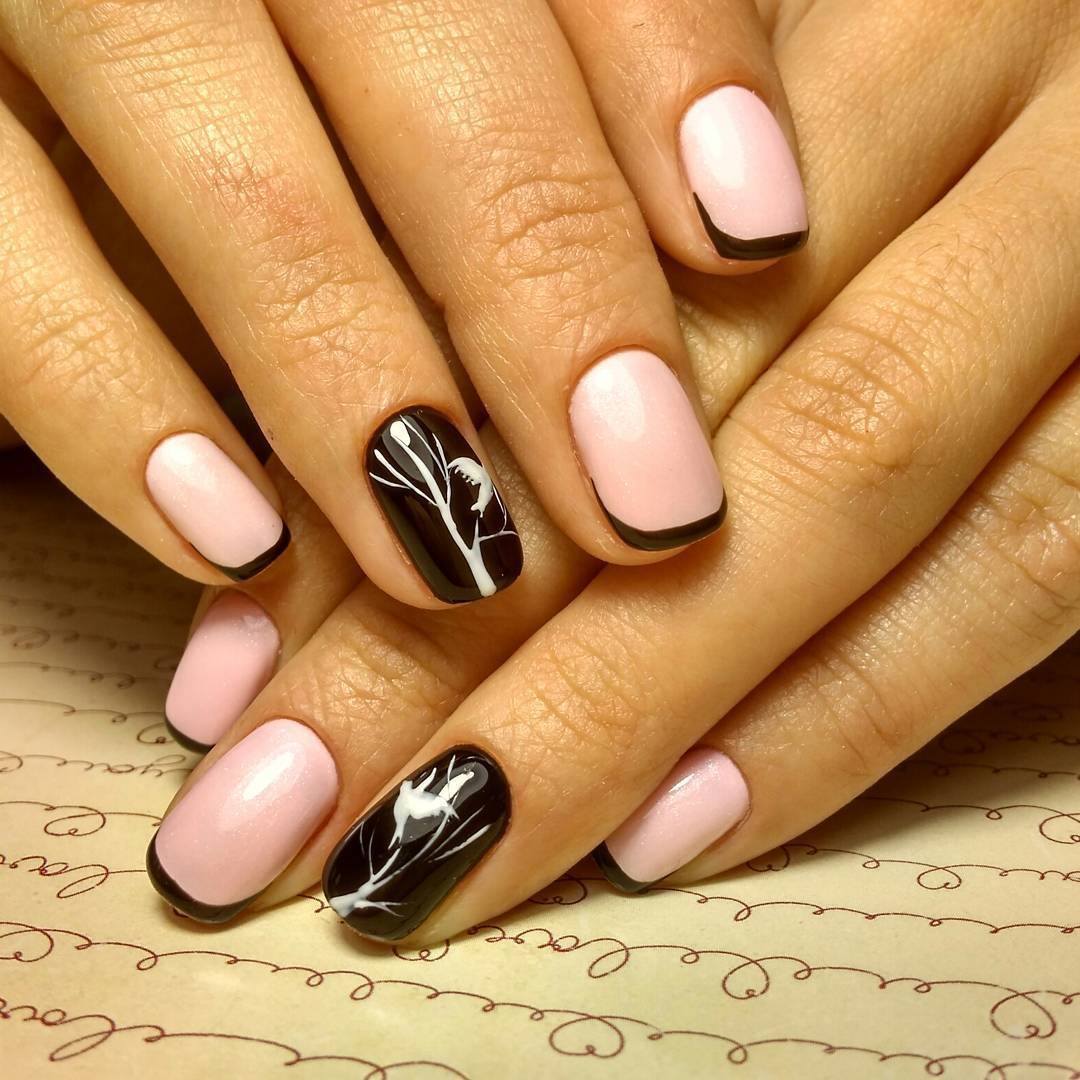 Особо оригинальным решением будет рисунок на двойном френче. Это могут быть как серьезные изображения цветов и бабочек, так и простые узоры в виде точек и полосок. Обычно их выполняют контрастным к фону лаком — выглядит потрясающе.