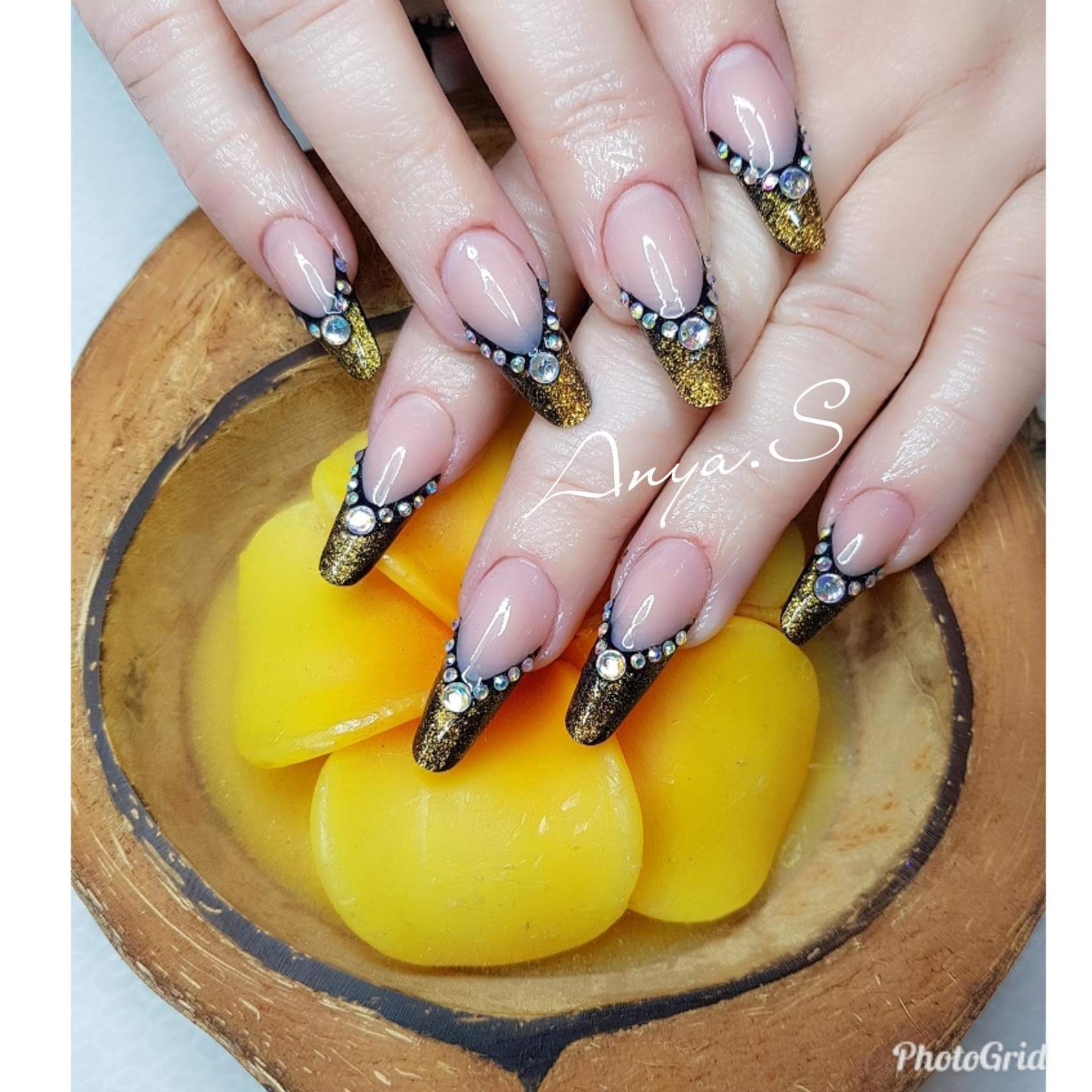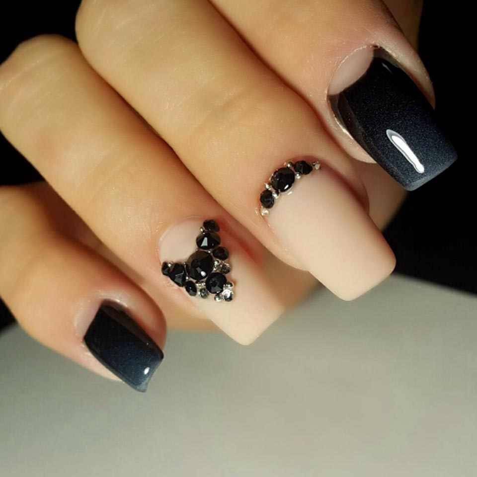 Россыпи сияющих камней просто притягивают внимание к вашим ноготкам! Попробуйте использовать в маникюре стразы чёрного цвета, и они поразят вас своим магическим и завораживающим блеском. Украсьте основание ногтя или линию улыбки, и останетесь довольны результатом