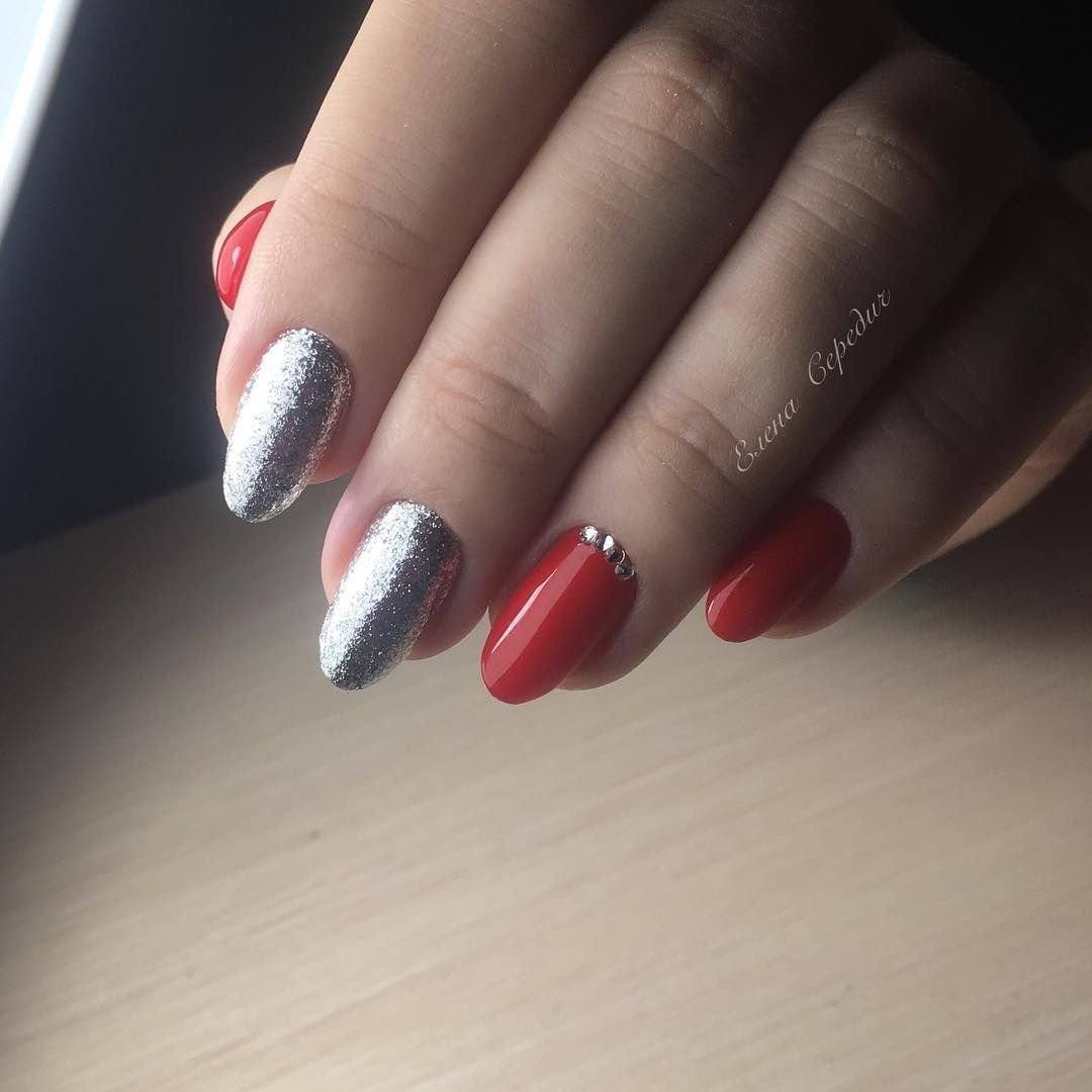 И в случае с блестящим декором можно сделать красный маникюр с синими блестками, отделкой металлических цветов или разноцветным дополнением. Насыщенности всему образу добавит красно-черный градиент с выделением блестящим материалом одного пальца по фен-шуй. Любой дизайн можно интересно сочетать и с матовым топом, стразами, лентами фольги или втиркой.