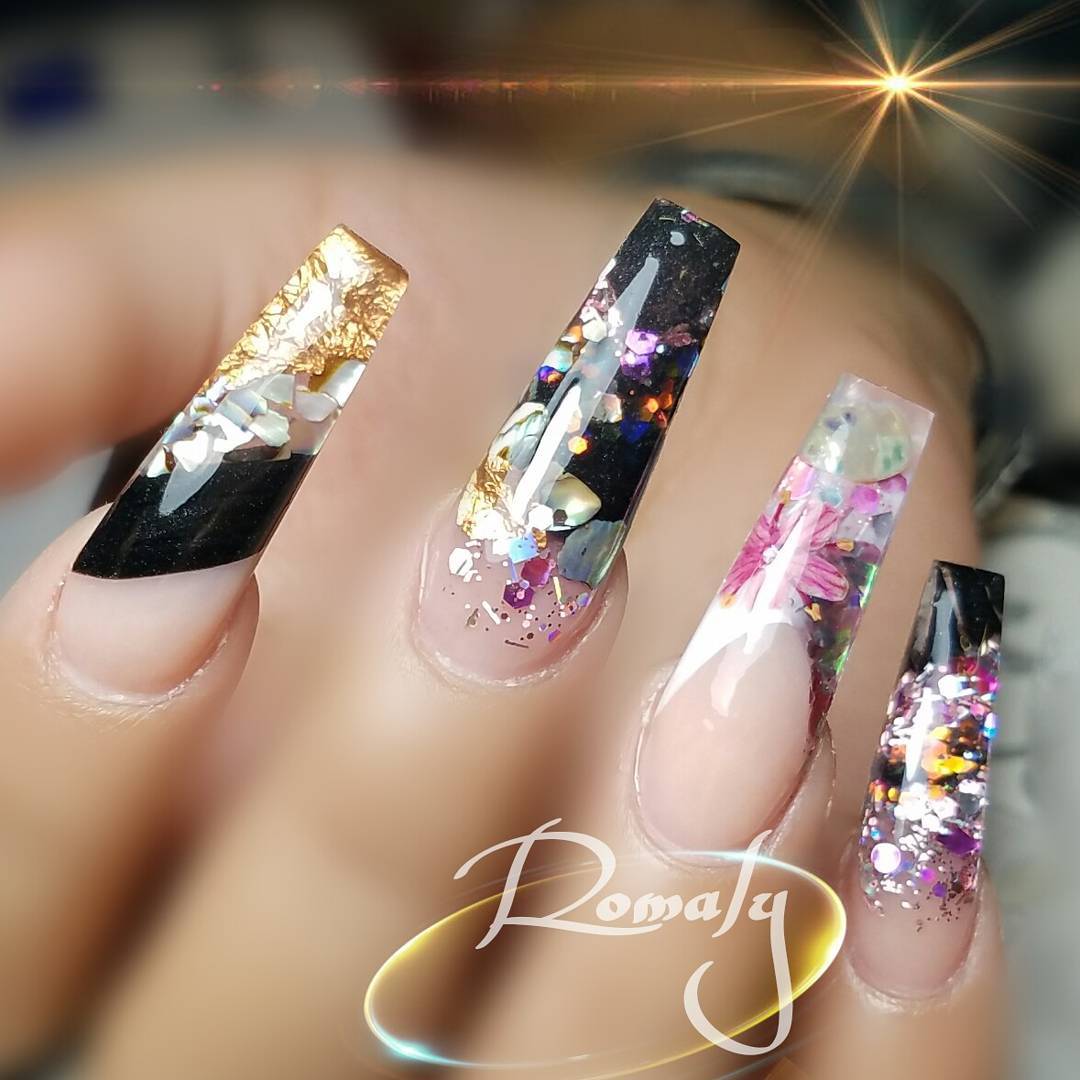 - Практичность. Поверхность ногтя несмотря на использование таких материалов как блестки, сушеные цветы и пр. остается гладкой (в этом помогает верхний слоя геля), что не представляет опасности при выполнении повседневных дел и домашней работы.
