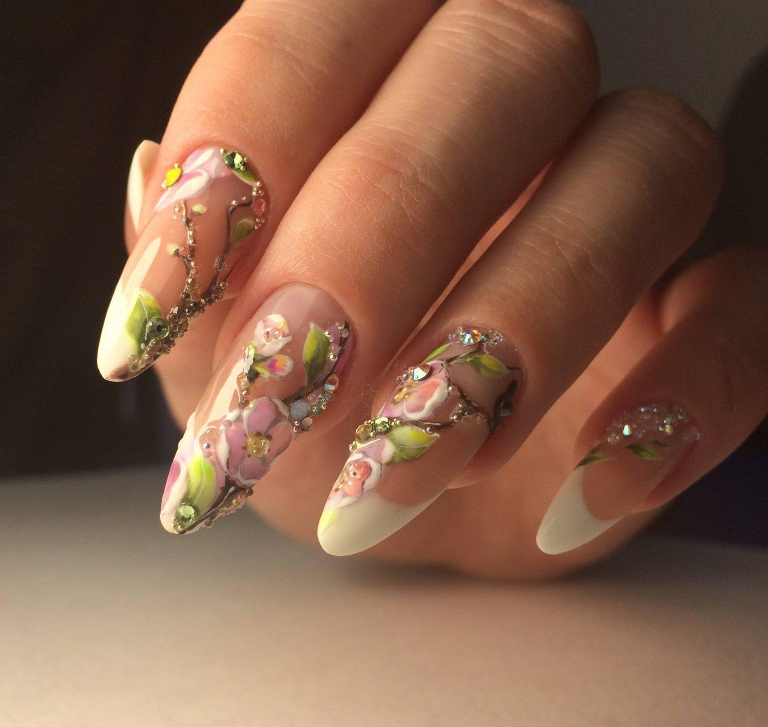 - Смотрите, как красиво и элегантно смотрится френч с цветочной тематикой, украшенный бульонками на основе миндалевидной формы.