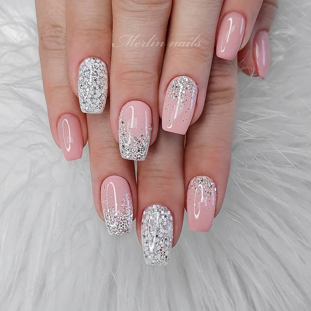 Подобная идея маникюра считается идеальным решением для создания повседневного нейл-дизайна. Молочный, бежевый, персиковый, песочный либо светло-розовый оттенок в такой ситуации будут смотреться просто роскошно на ногтевой пластине. При помощи блёсток на таких ноготках можно выделить лунулу у основания, прорисовать кончик ноготка в виде феерического сияющего френча либо оформить растяжку в стиле градиент. Особенно красиво смотрятся комбинированные вариации расположения блестящих частиц. Например, тандем блестящего френча и лунок на паре ноготков, однотонное покрытие и растяжка на безымянном пальце либо использование блёсток в виде полос, оттиска фольги или втирки.