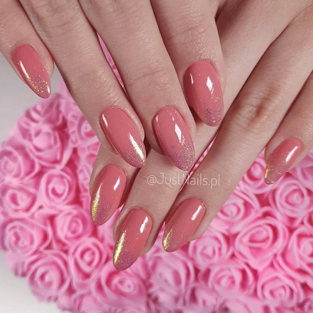 Лак с шиммером можно наносить полностью на все ногти или использовать в комбинации с другими материалами. Покройте лаком с шиммером один ноготок, еще на один нанесете глиттер того же оттенка, что и шиммер в лаке, а все остальные ногти покройте розовой камуфлирующей базой. Получится красивый и нескучный маникюр.