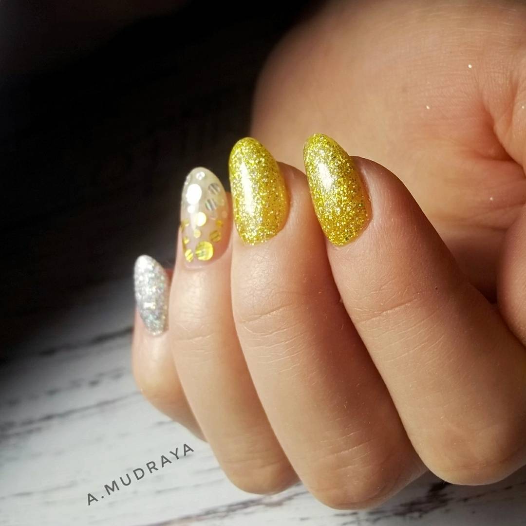 Блестки расположите на 1-2 пальцах руки. Покройте ими ногтевую пластину полностью, желательно в несколько слоев, чтобы блестки смотрелись гораздо выразительнее и ярче. Для дизайна можно использовать гель-лаки с шиммером или глиттером, сухие блестки, крупные пайетки. Что касается оттенка, то для повседневного образа рекомендуется использовать серебряные блестки.