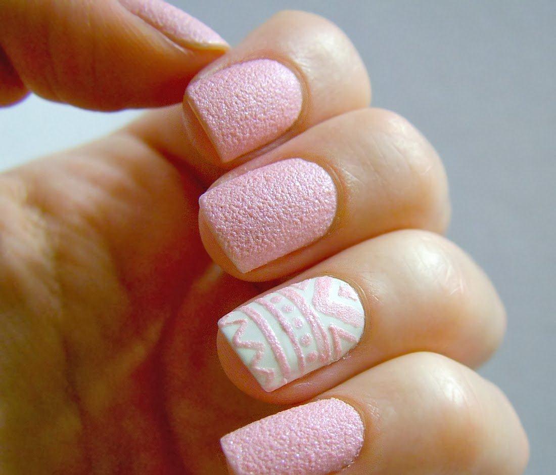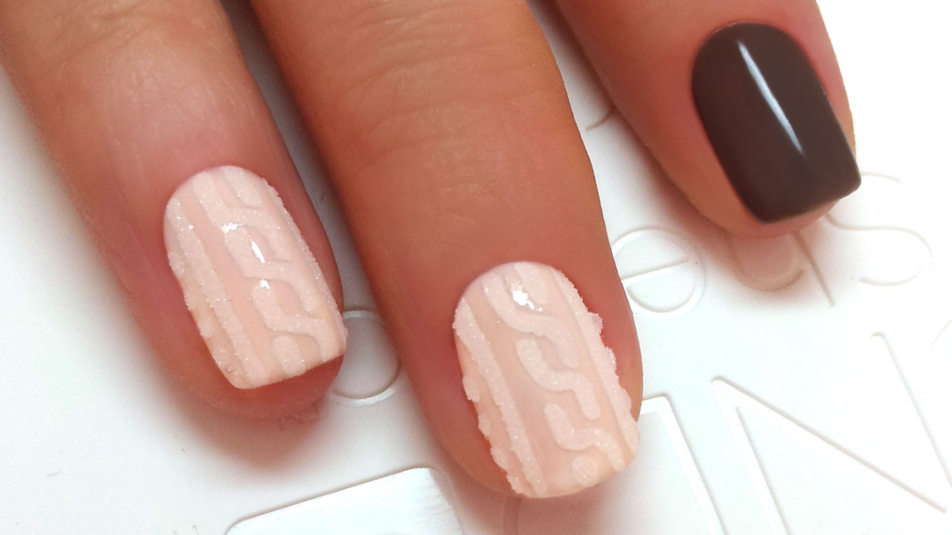 Процесс нанесения декоративного песка не отличается от использования флока. Благодаря мелкой текстуре песок часто используется для создания «вязаных» узоров на ногтях в нежных розовых или голубых оттенках.