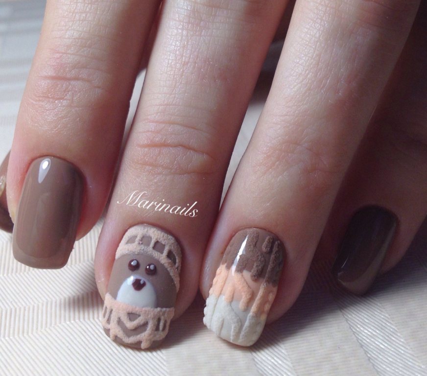 Тёплый зимний маникюр с росписью кистью рисунков варешки и шапки на коротких ногтях. Коричневый матовый гель-лак. Финальная фишечка использование флока.