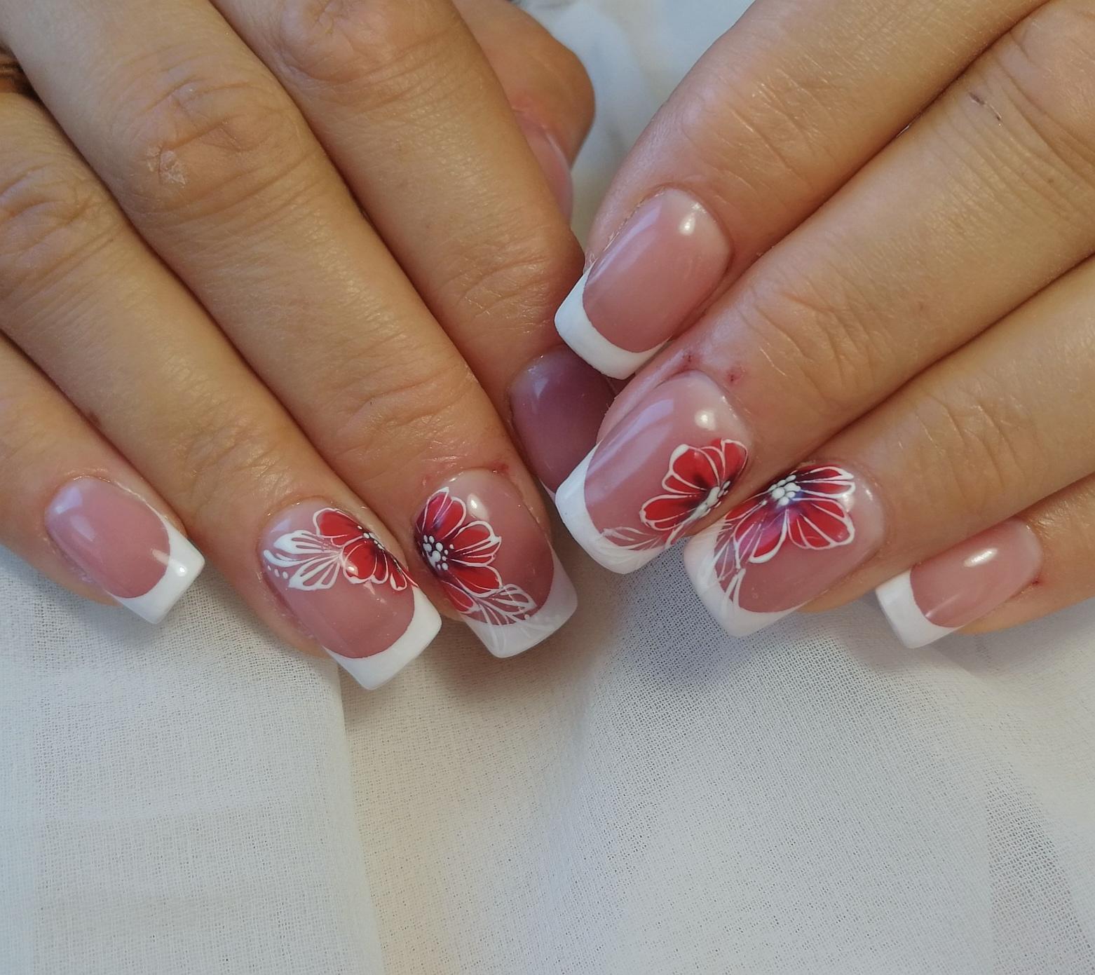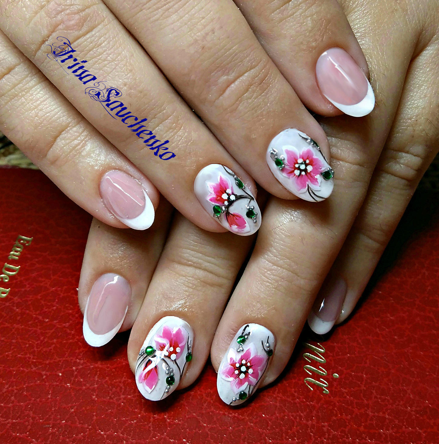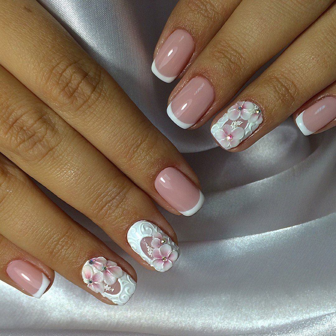 Практически все девушки любят дополнять классический френч какими-то элементами декора. Одним из них являются цветочные бутоны. Ажурные или цветочные орнаменты с легкостью создадут невероятный лук для девушек. Именно поэтому образы модниц становятся нежнее и изысканнее. Но стоит помнить, большое количество рисунков на ноготках смотрится слишком вызывающе. Поэтому нежные лепестки цветов стоит выполнять всего лишь на одном или двух ноготках. Данным видом дизайна очень часто пользуются невесты при создании свадебного образа. В таких случаях иногда мастера предлагают французский маникюр с лепкой