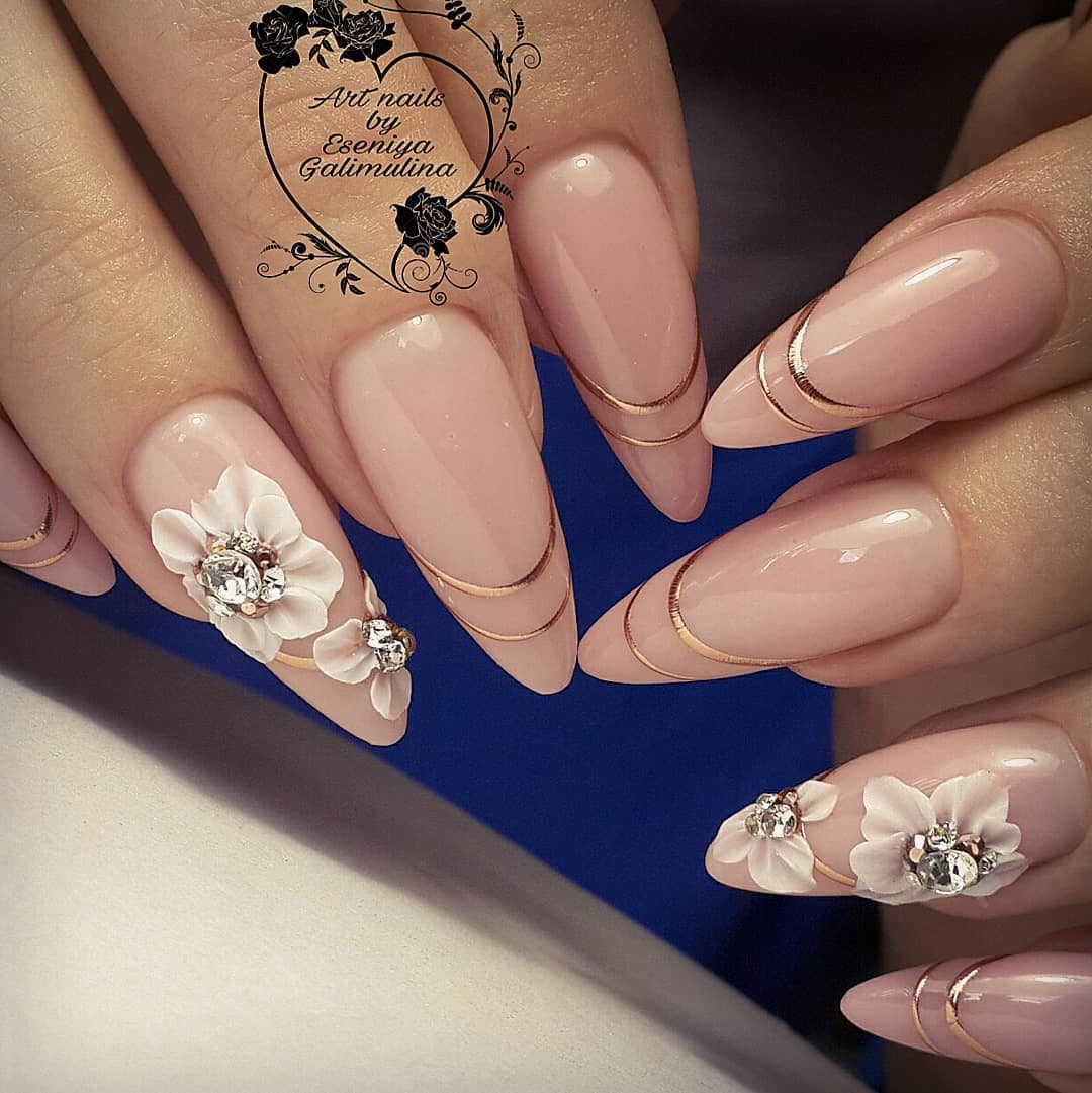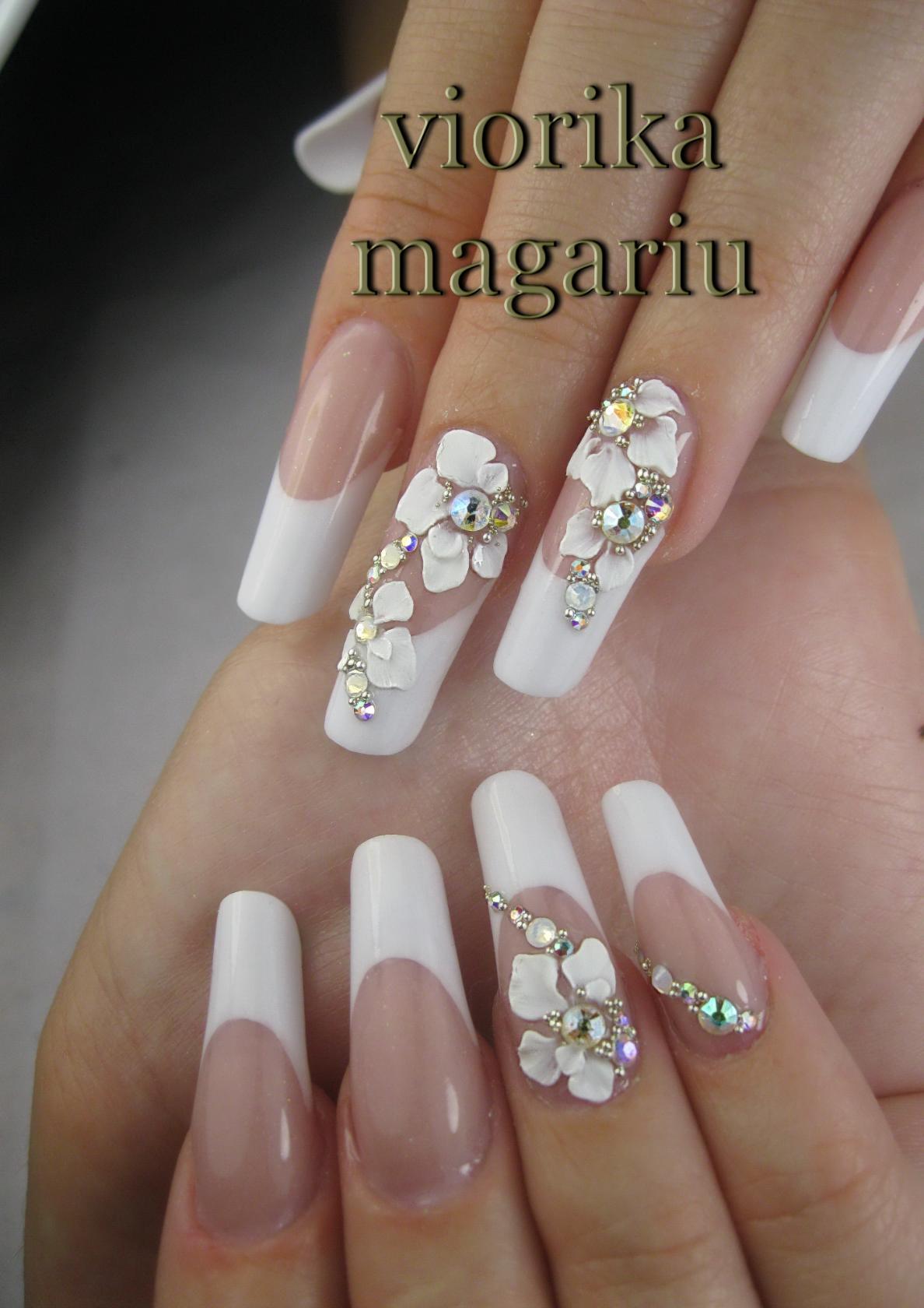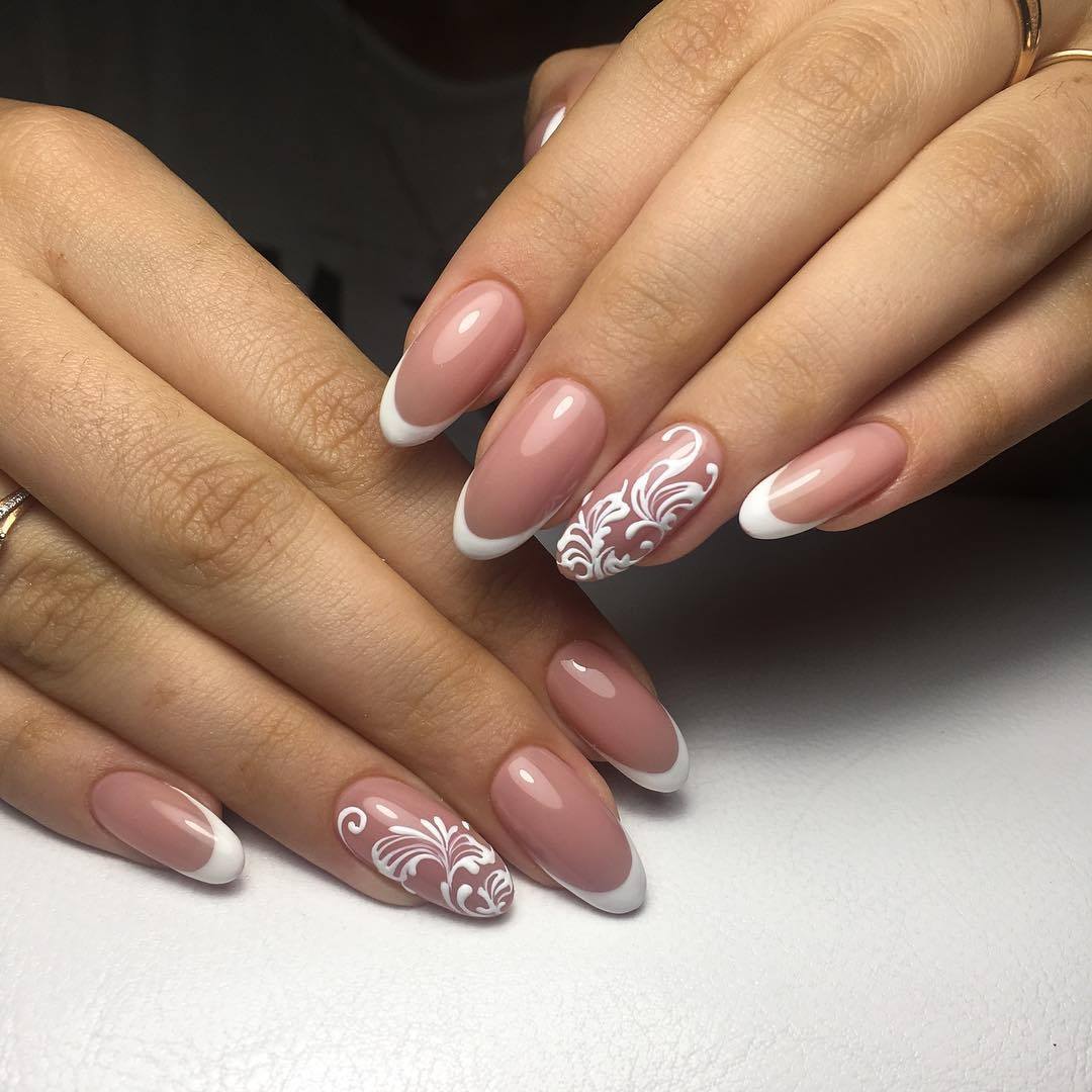 Практически все девушки любят дополнять классический френч какими-то элементами декора. Одним из них являются цветочные бутоны. Ажурные или цветочные орнаменты с легкостью создадут невероятный лук для девушек. Именно поэтому образы модниц становятся нежнее и изысканнее. Но стоит помнить, большое количество рисунков на ноготках смотрится слишком вызывающе. Поэтому нежные лепестки цветов стоит выполнять всего лишь на одном или двух ноготках. Данным видом дизайна очень часто пользуются невесты при создании свадебного образа. В таких случаях иногда мастера предлагают французский маникюр с лепкой