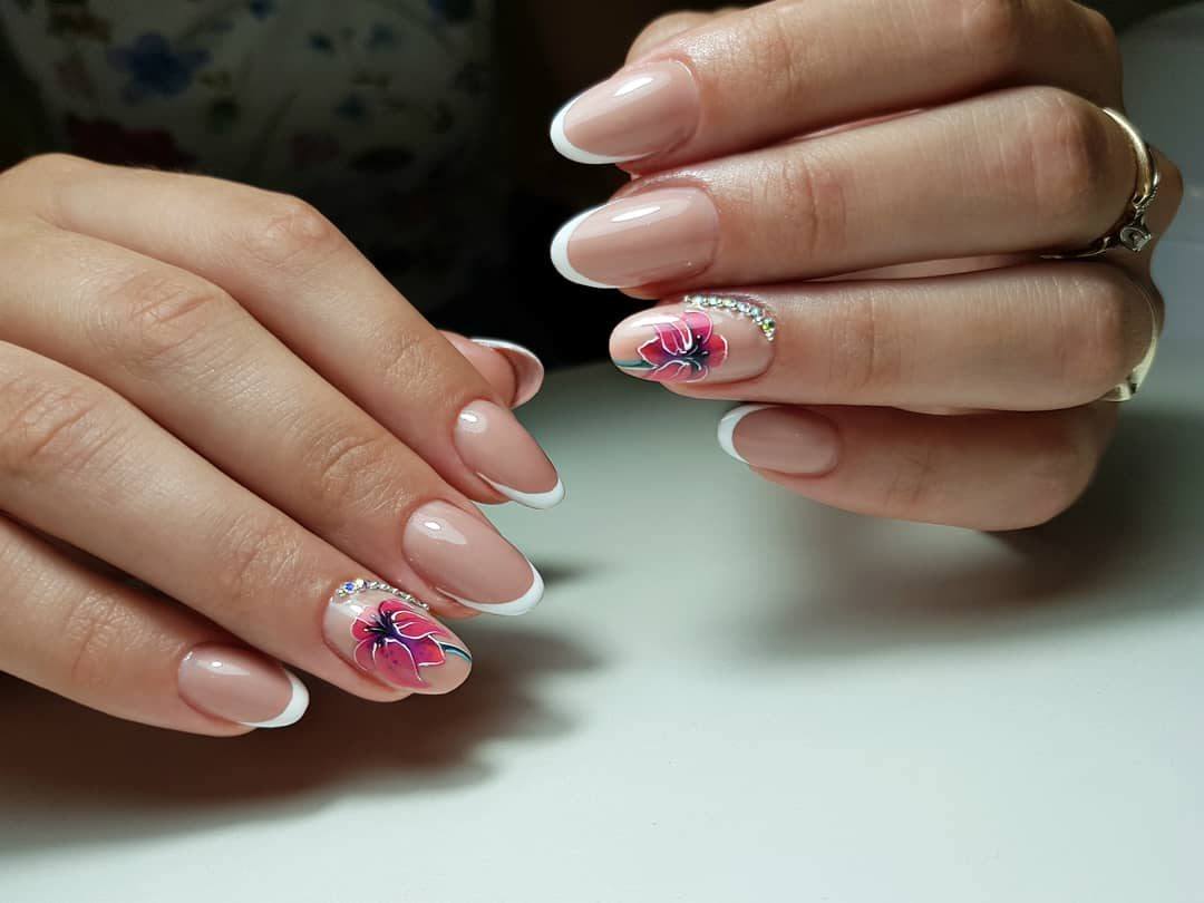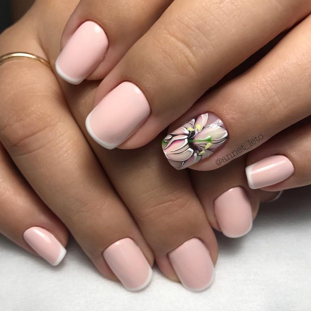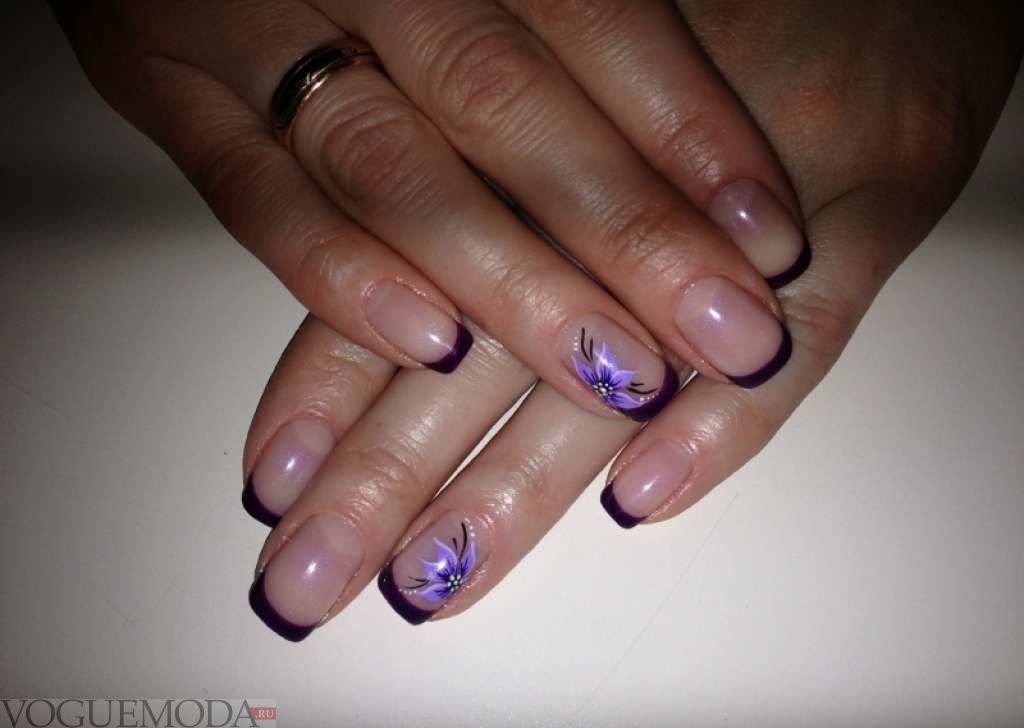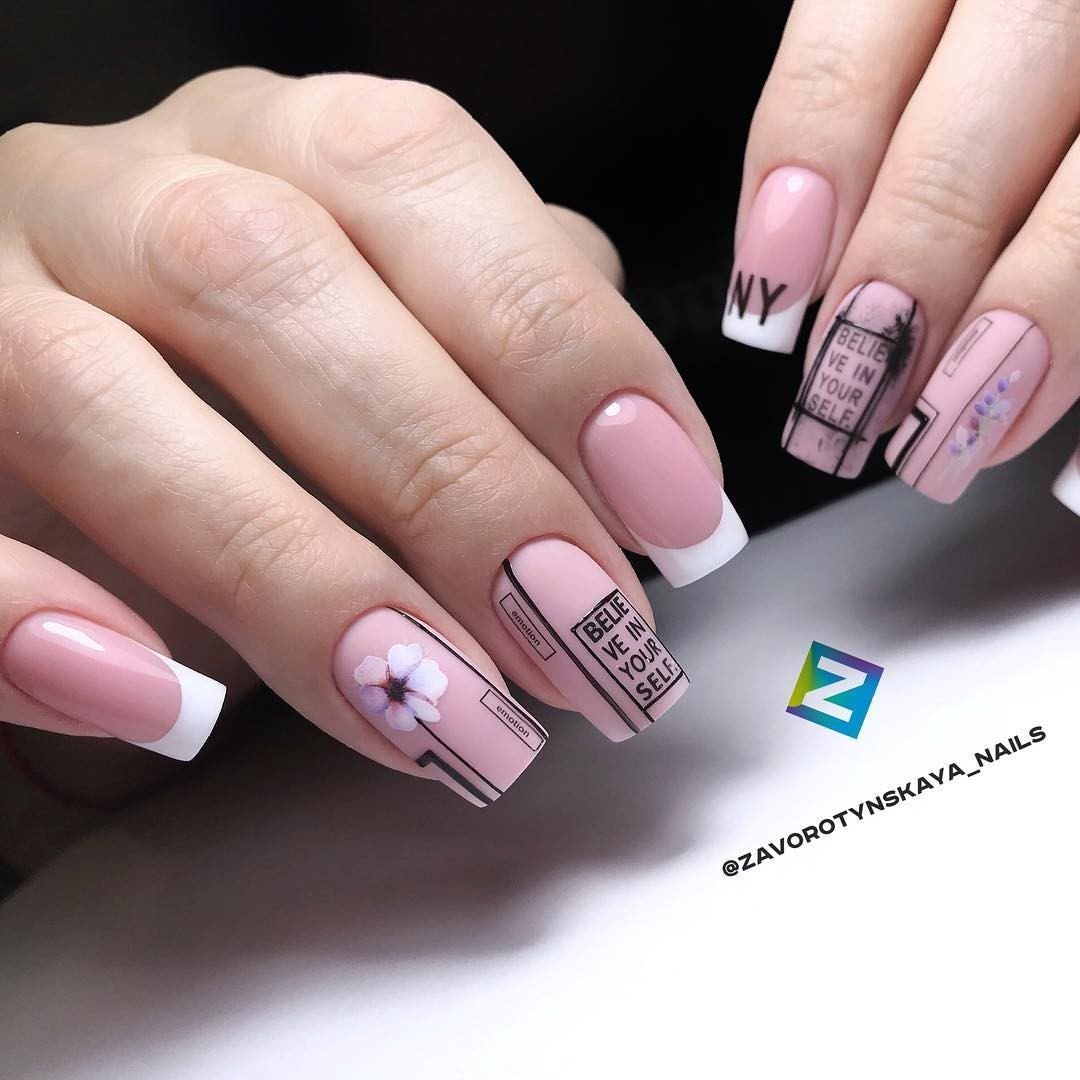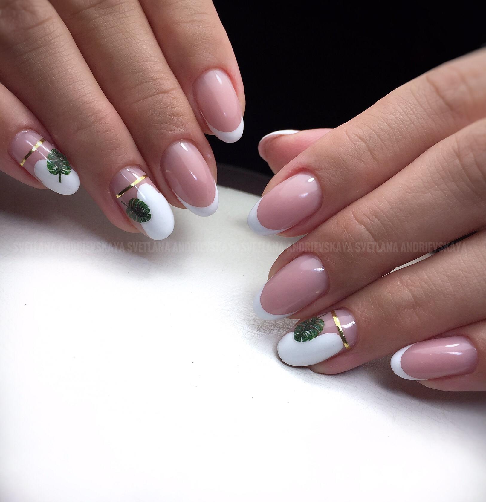 В топе модных тенденций французский маникюр с рисунком. Здесь несколько ногтей дополнительно украшаются рисунком. Выбор принта зависит от вашей фантазии, но все еще популярны растительные, абстрактные и цветочные мотивы.