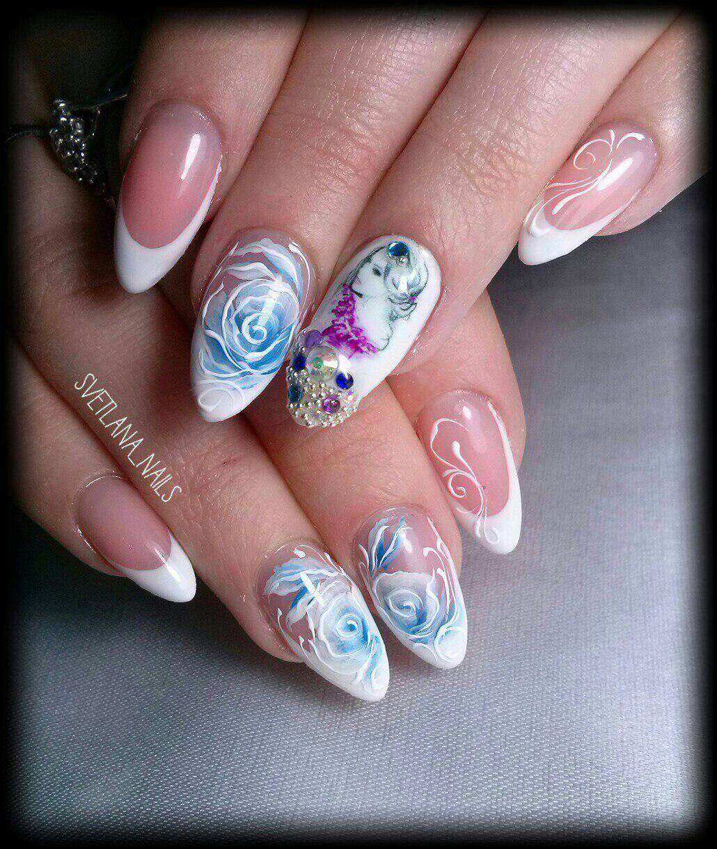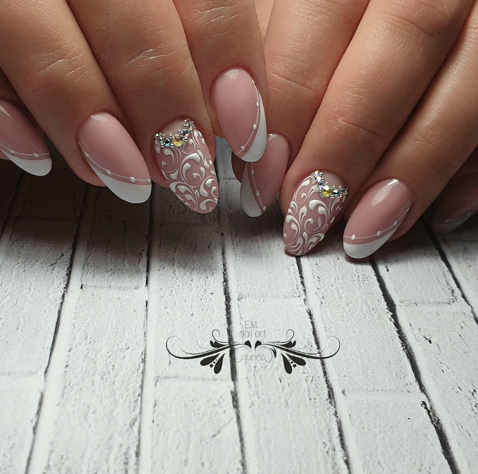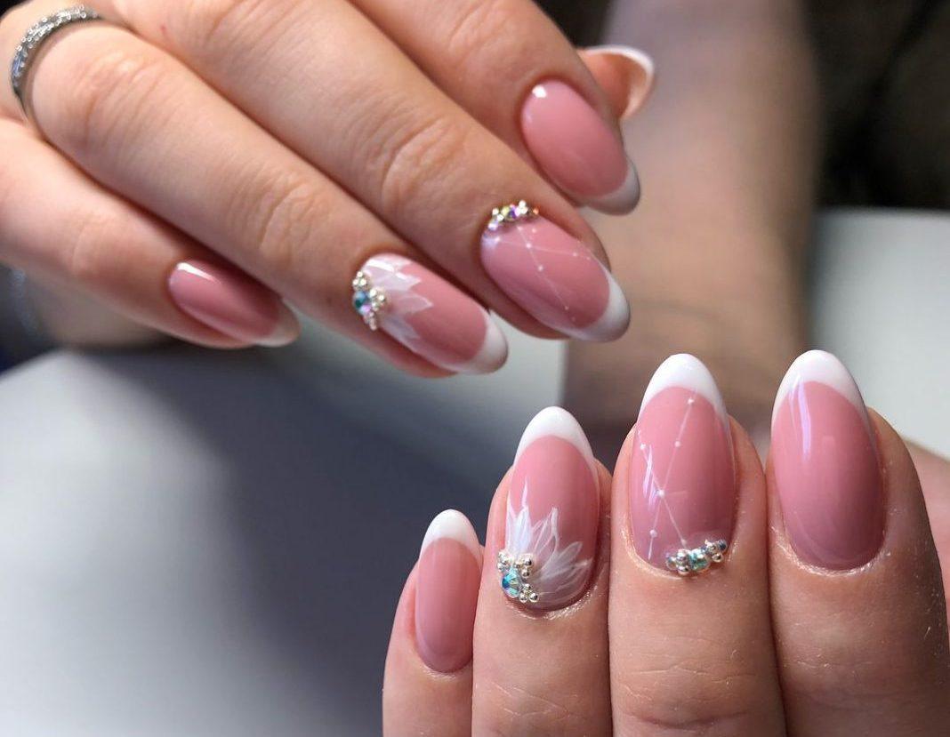 Традиционный белый маникюр на свадьбу можно разбавить розовыми тонами. Дизайн состоит из глянцевого слоя бледно-розового лака, наконечники выполнены в белом цвете и покрыты розовыми блестками. Центральное место занимает затейливая ручная роспись. Цветочки дополнительно декорируются стразами.