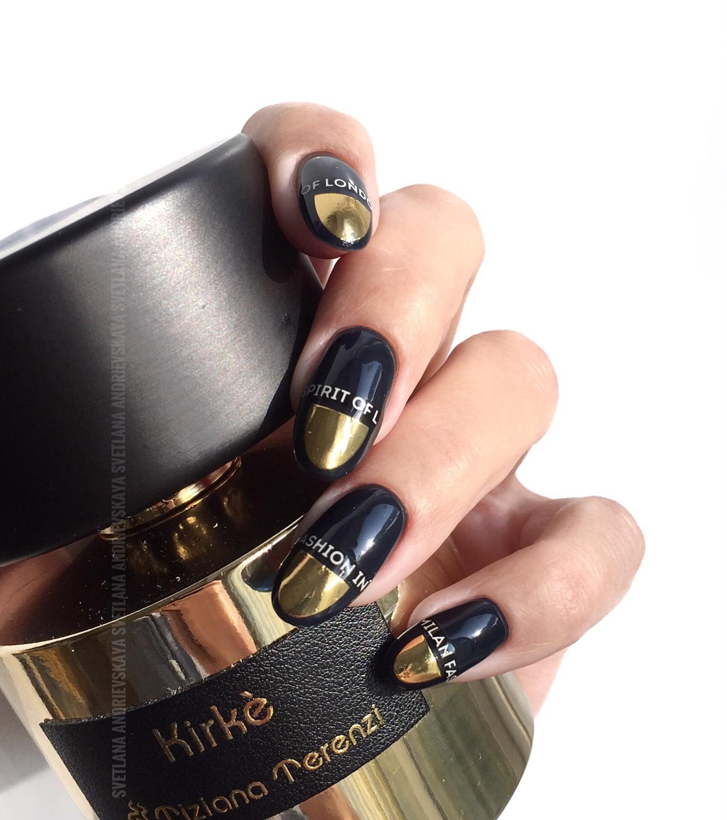 Если ими выложить обратный френч, результат получится восхитительным, особенно шикарно смотрится сочетание чёрного с золотом или серебром.