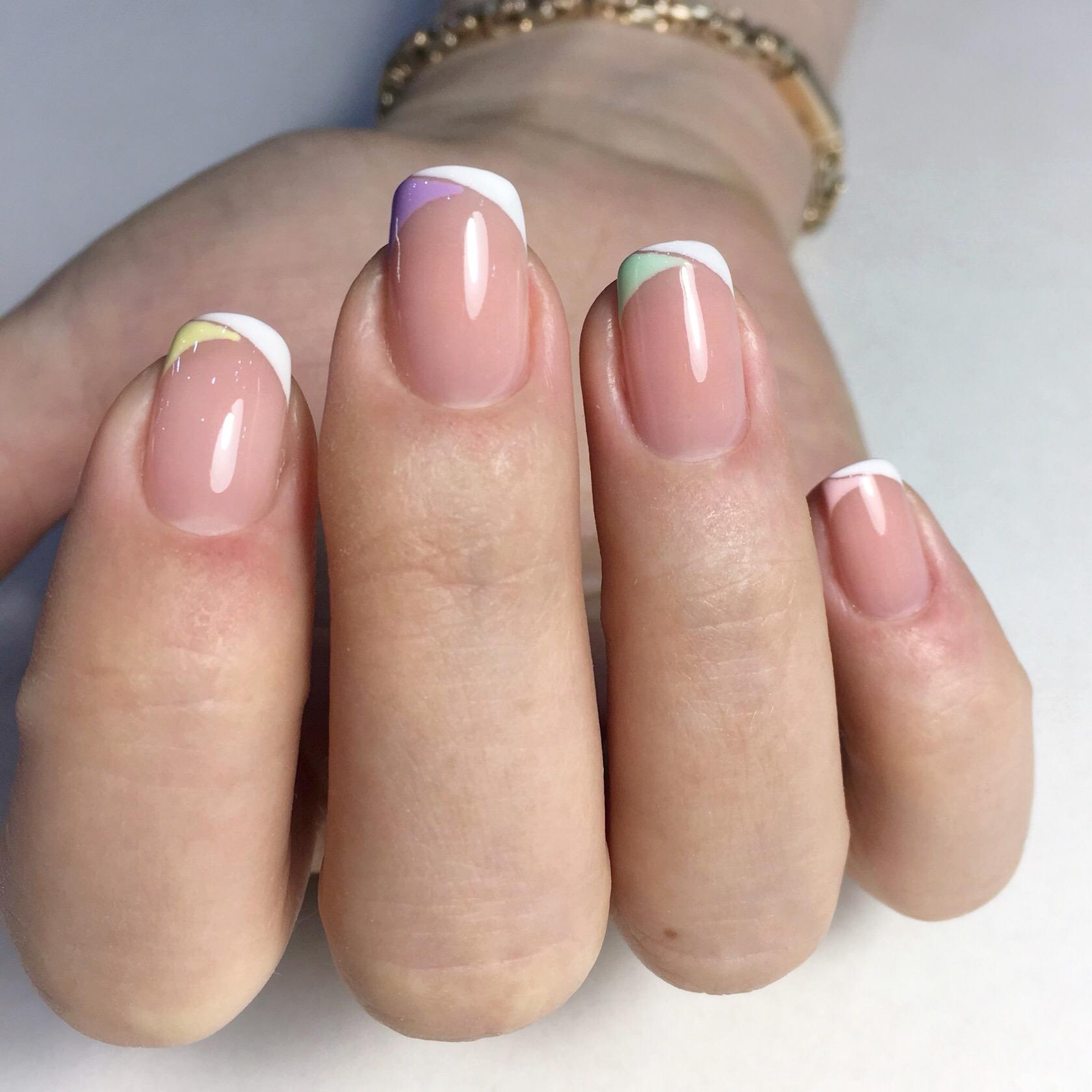 С французским маникюром нередко комбинируют радужный дизайн. Это плавный переход оттенков для которого используются все цвета радуги. В результате получается яркий, свежий маникюр — идеальный вариант на лето.